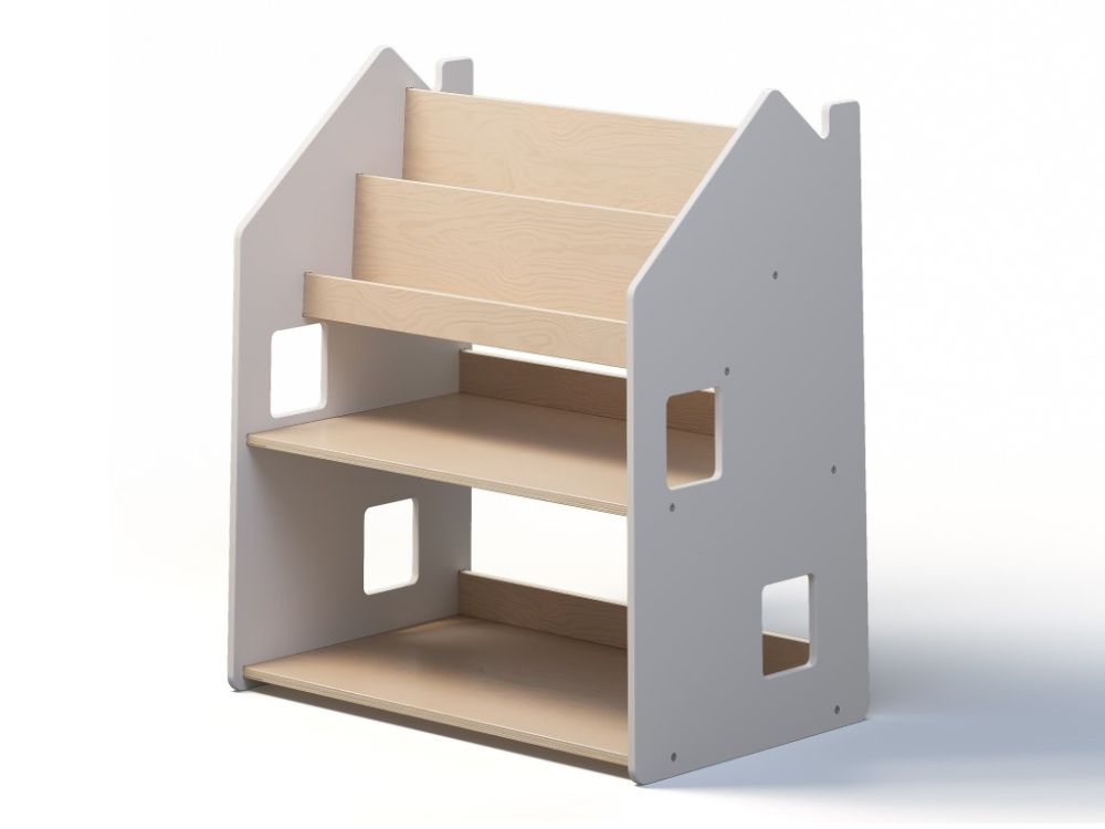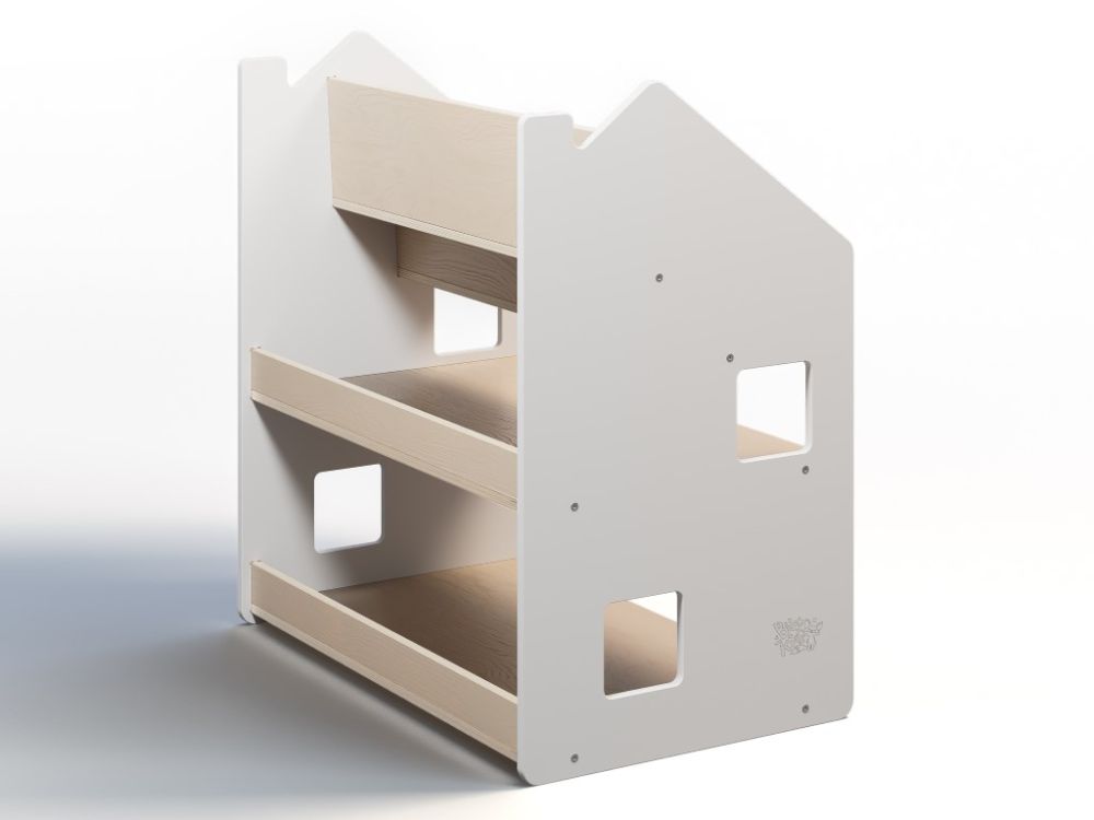 Dječja biblioteka – Kuća 2u1 prirodna/bijela može se nadopuniti policom u dizajnu kućice za još veći kapacitet pohrane. U ELIS DESIGN-u biramo i stvaramo smislene igračke i namještaj od kvalitetnih materijala, inspirirane Montessori pristupom, koje ne samo da zabavljaju nego i razvijaju djecu.