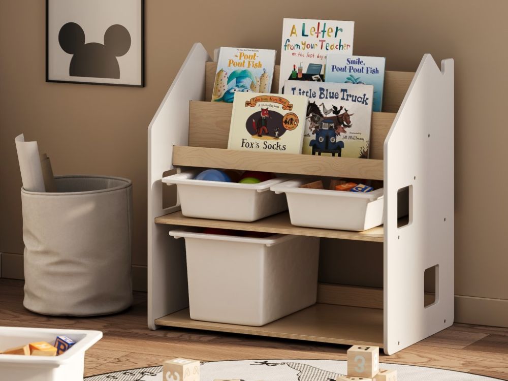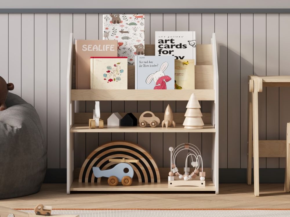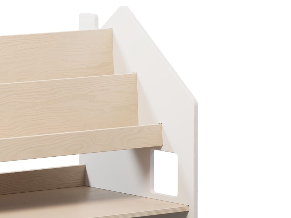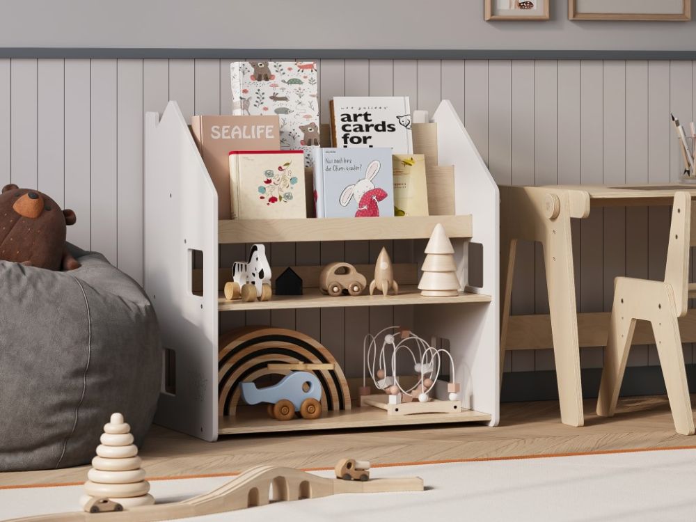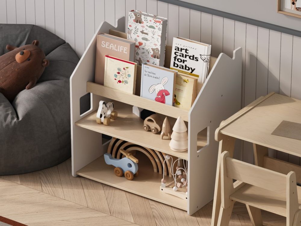 Dječja biblioteka – Kuća 2u1 prirodna/bijela postat će središnji element svake dječje sobe. Moderan dizajn skandinavskog stila u kombinaciji prirodnih i bijelih tonova donosi sklad u vaš dom, a djeca će se radovati vlastitoj polici koja je istovremeno i stilski detalj prostora. Pristupačne police inspirirane Montessori pedagogikom potiču djecu na samostalno odabiranje knjiga i razvijaju smisao za red i organizaciju.