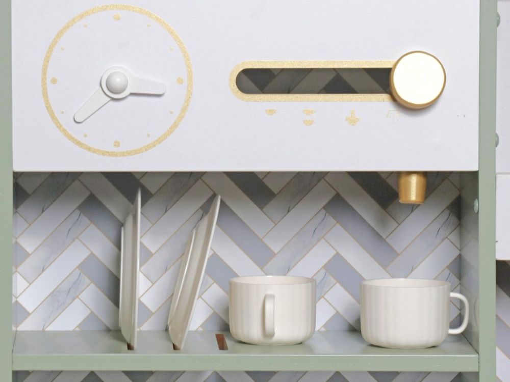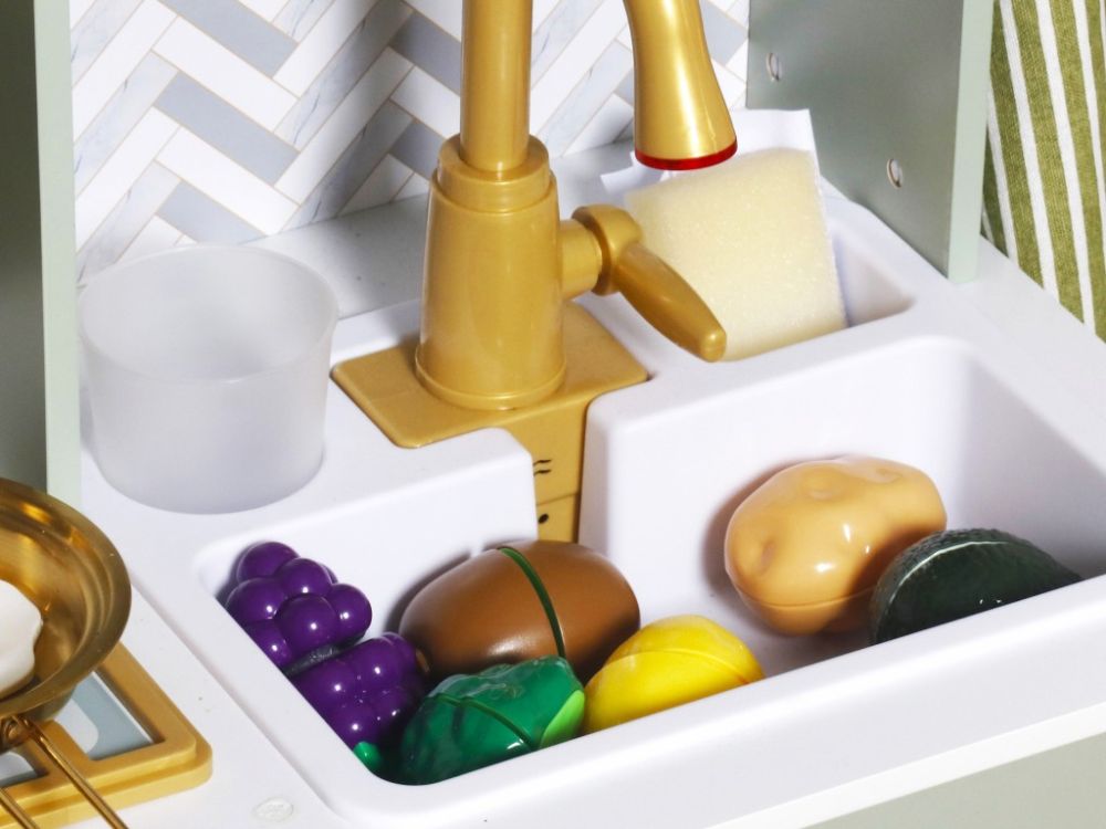 Kuhinja se ističe elegantnim dizajnom u zelenkastoj nijansi sa zlatnim detaljima, što je čini savršenim dodatkom svakoj dječjoj sobi ili dnevnom boravku.