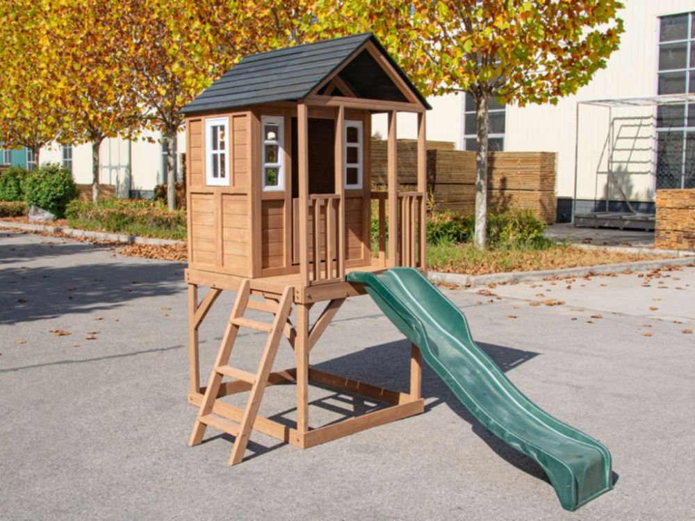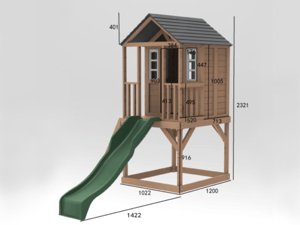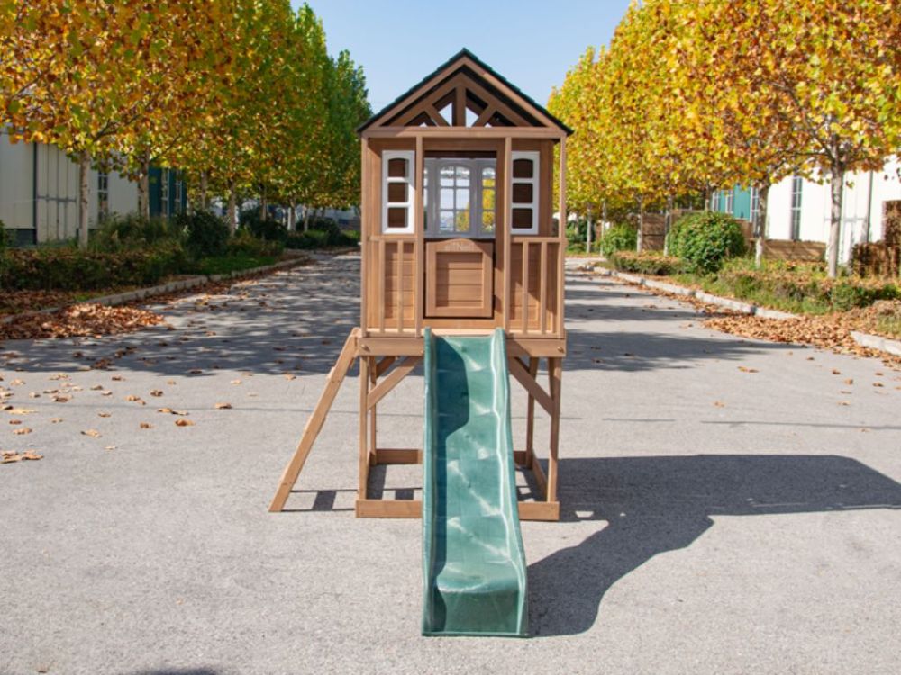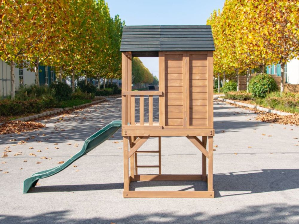Dječja drvena vrtna kućica s toboganom pruža djeci aktivnu i maštovitu igru na otvorenom. Podignuta platforma, ugrađeni tobogan i ljestve omogućuju sigurno penjanje, spuštanje i istraživanje. Prostor ispod platforme može se koristiti kao pješčanik, čime kućica nudi više zona za igru u jednoj konstrukciji. Idealna je za dvorište ili vrt te potiče kretanje, kreativnost i razvoj motoričkih vještina.