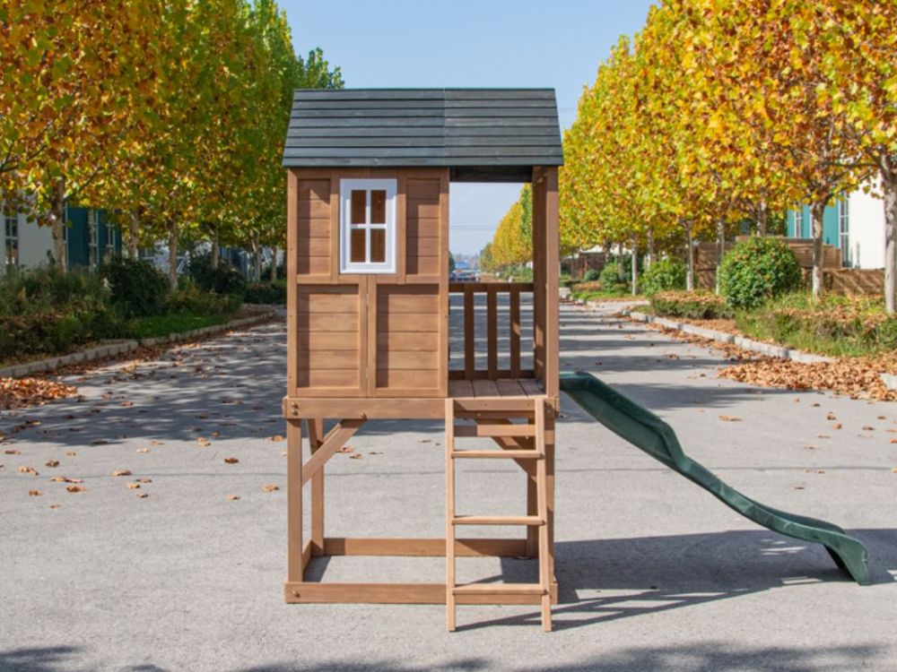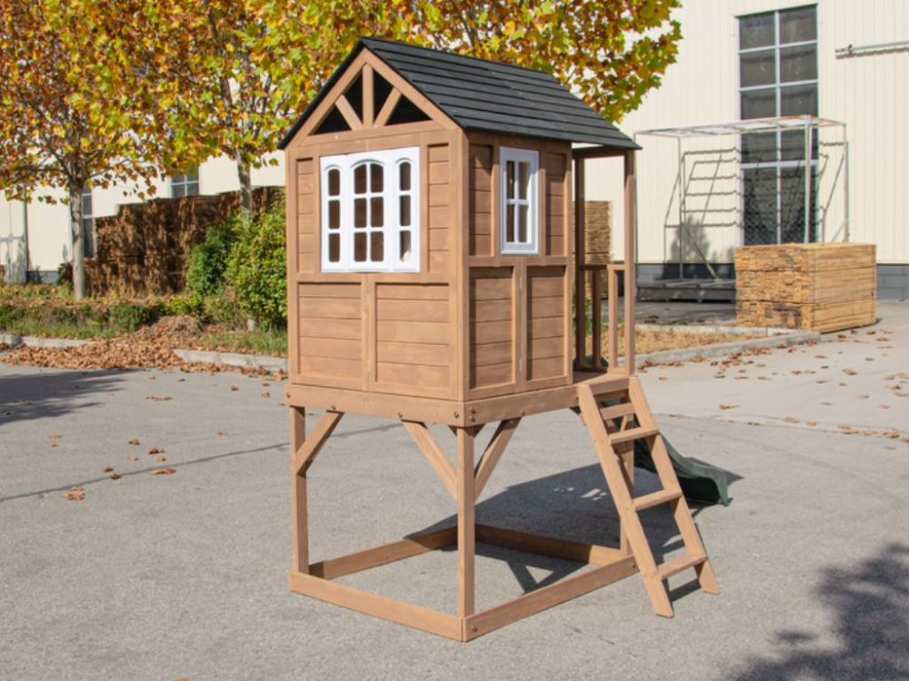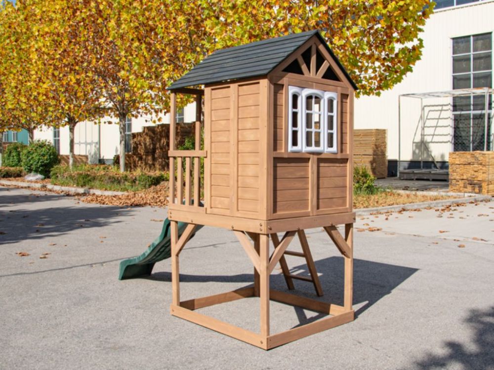 Ova povišena drvena kućica za igru u europskom stilu s platformom, toboganom i pješčanikom nudi prostor za aktivnu igru i razvoj dječje mašte. Siguran, izdržljiv i jednostavan za održavanje dodatak svakom vrtu.
