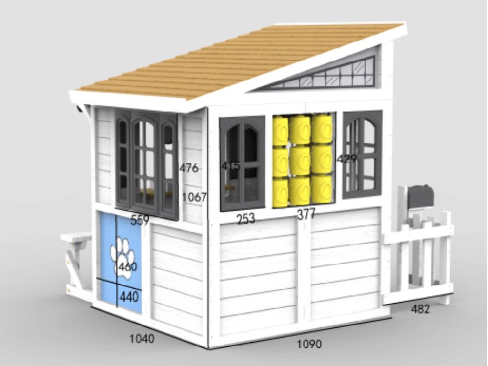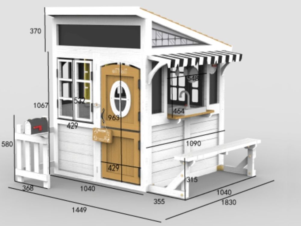 Vanjska kućica za igru s kosim krovom, izlogom, vratima, pločom za pisanje kredom i klupom stvara savršen prostor za igru uloga i kreativnu zabavu na otvorenom. Interaktivni elementi potiču maštu, društvenu igru i učenje kroz igru.