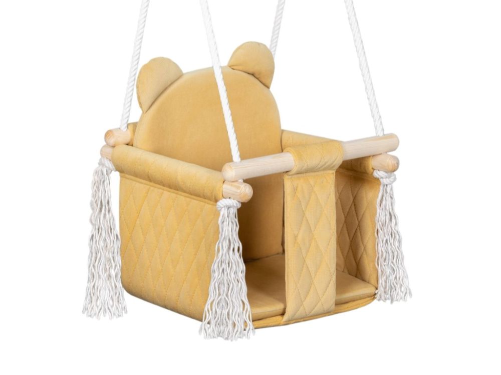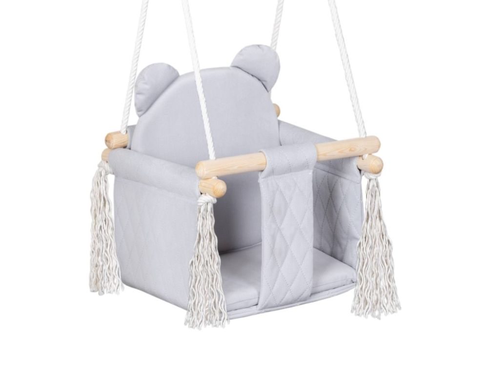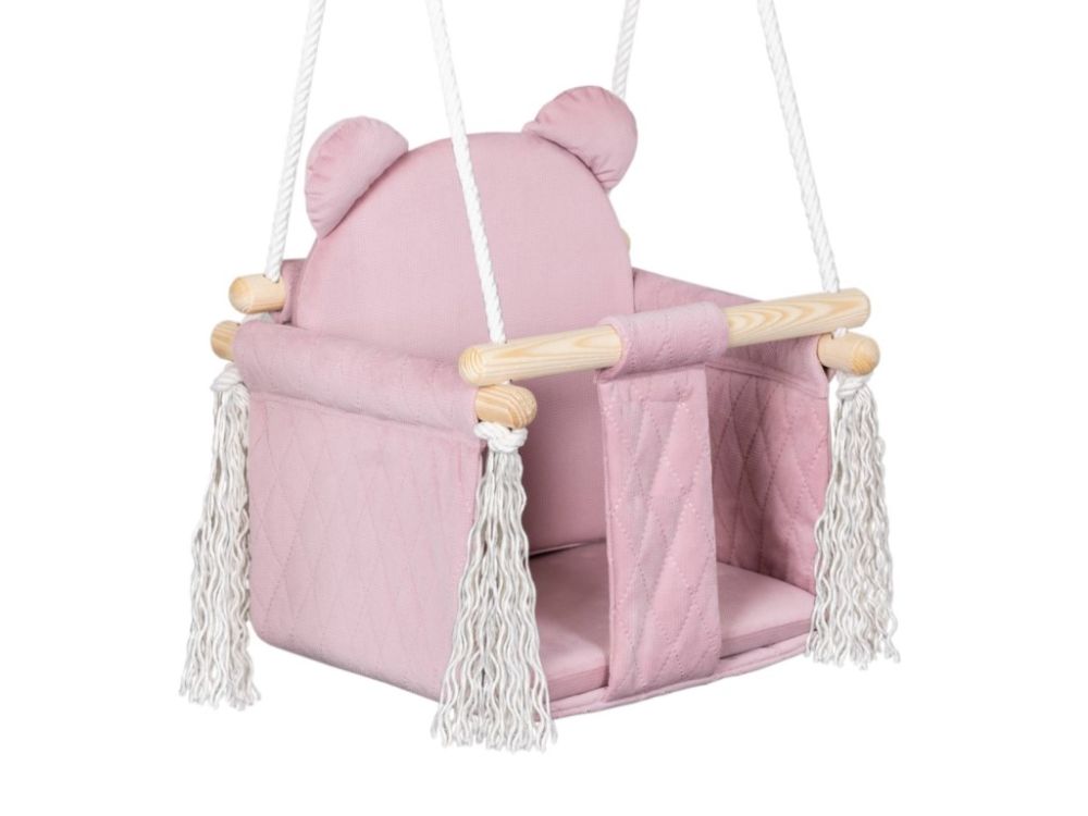 Dječja ljuljačka s naslonom Medvjedić izrađena je od kvalitetnog bukovog drva i presvučena mekanim baršunom s elegantnim prošivanjem i dugačkim ukrasnim resicama. Ljuljanje djeci donosi zabavu, osjećaj ugode i opuštanja, a zahvaljujući dostupnosti u više boja – za djevojčice, dječake i u neutralnim tonovima – lako se uklapa u svaki dječji interijer. Sigurna je za djecu već od 6 mjeseci, no dijete nikada ne smije ostati u ljuljački bez nadzora.