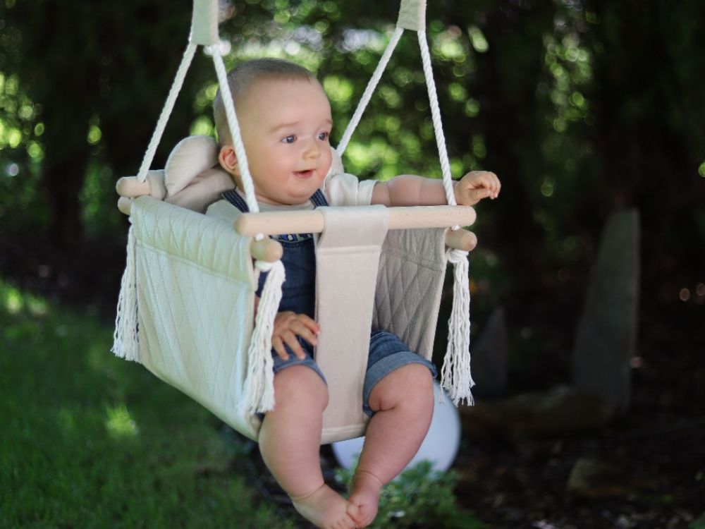 - Ojačano sjedalo i naslon – zahvaljujući ojačanju ljuljačka je udobna i sigurna; drvena konstrukcija ne pritišće dijete u leđa.
