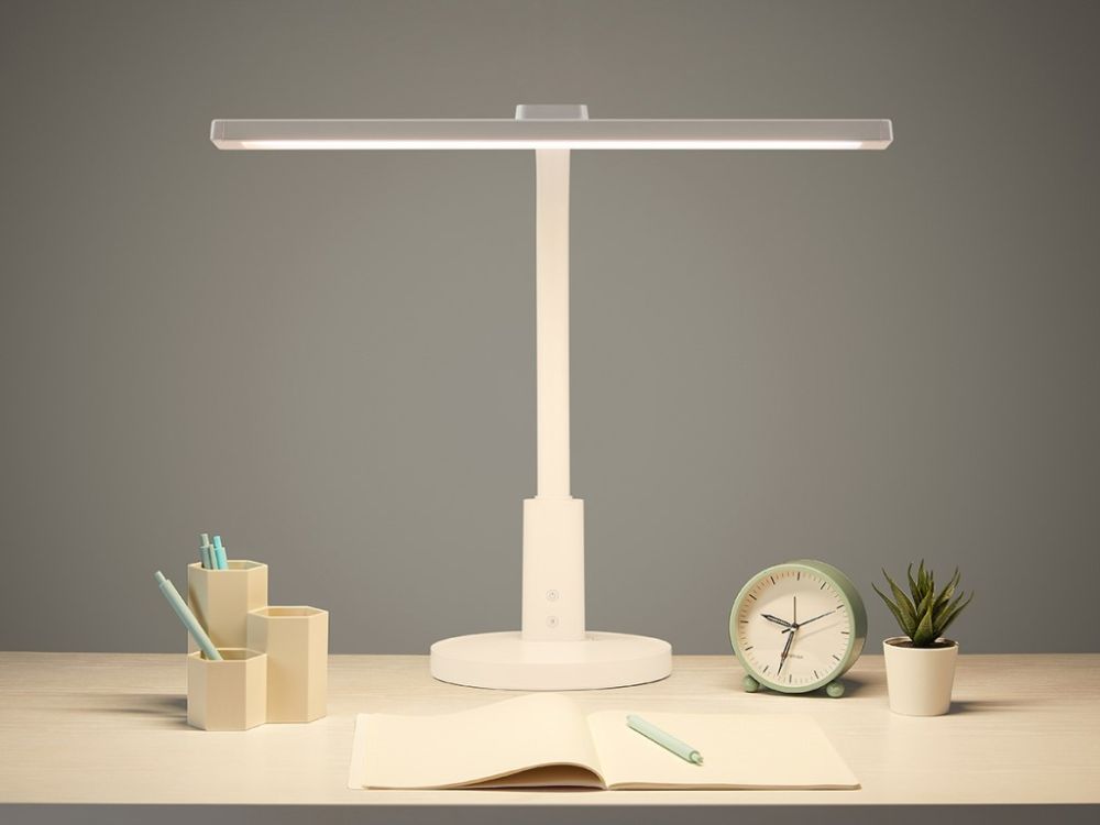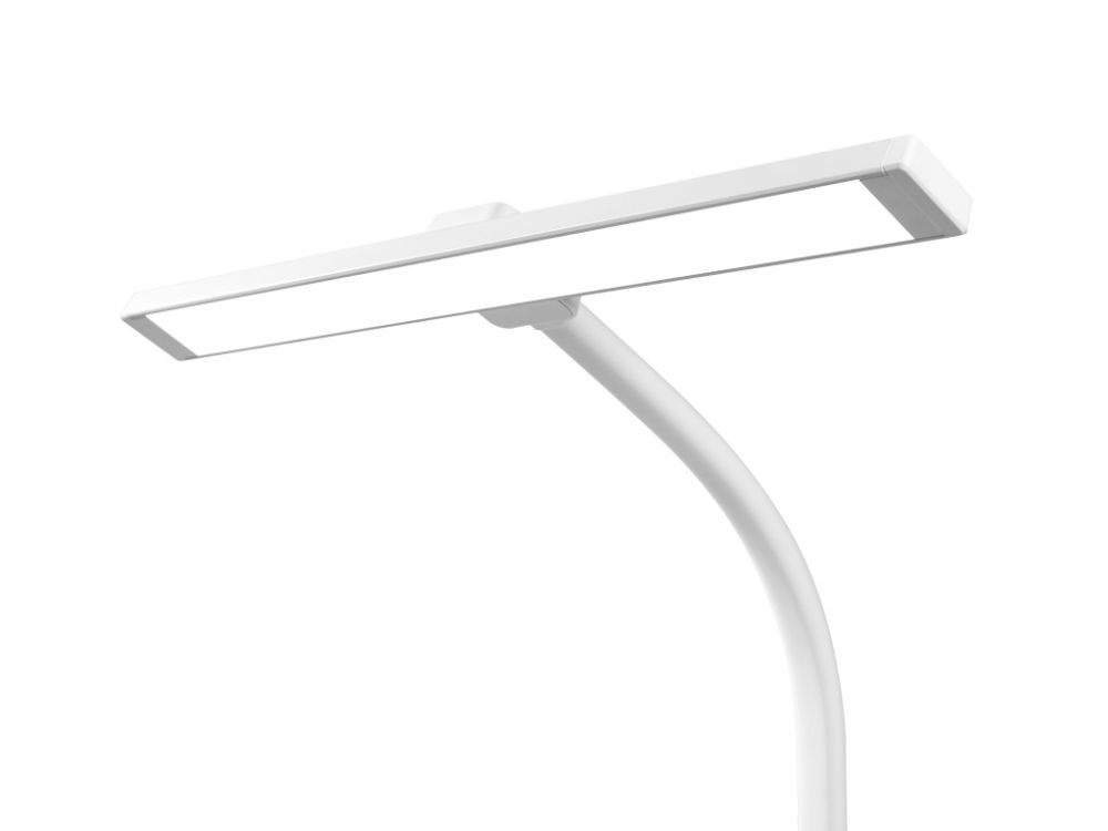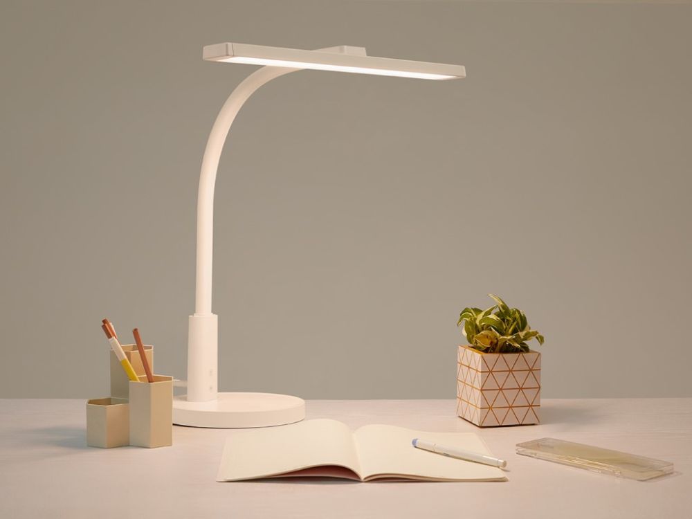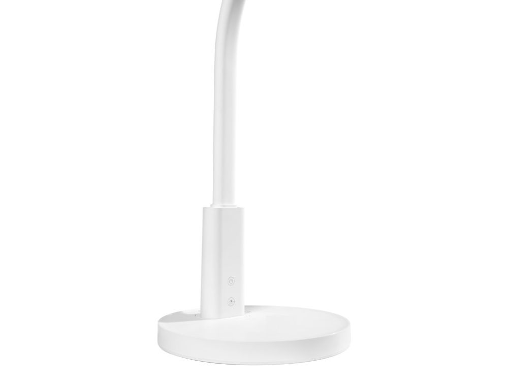 Bijela dječja stolna lampa s podesivom svjetlošću i temperaturom. Savitljiva ruka, velika površina svjetla, niska potrošnja energije. Za djecu od 3-18 godina.