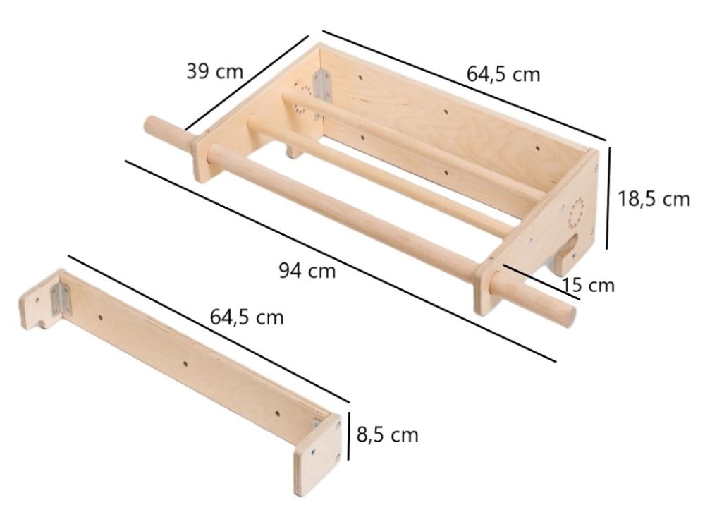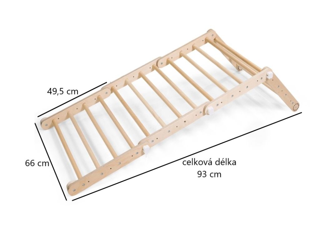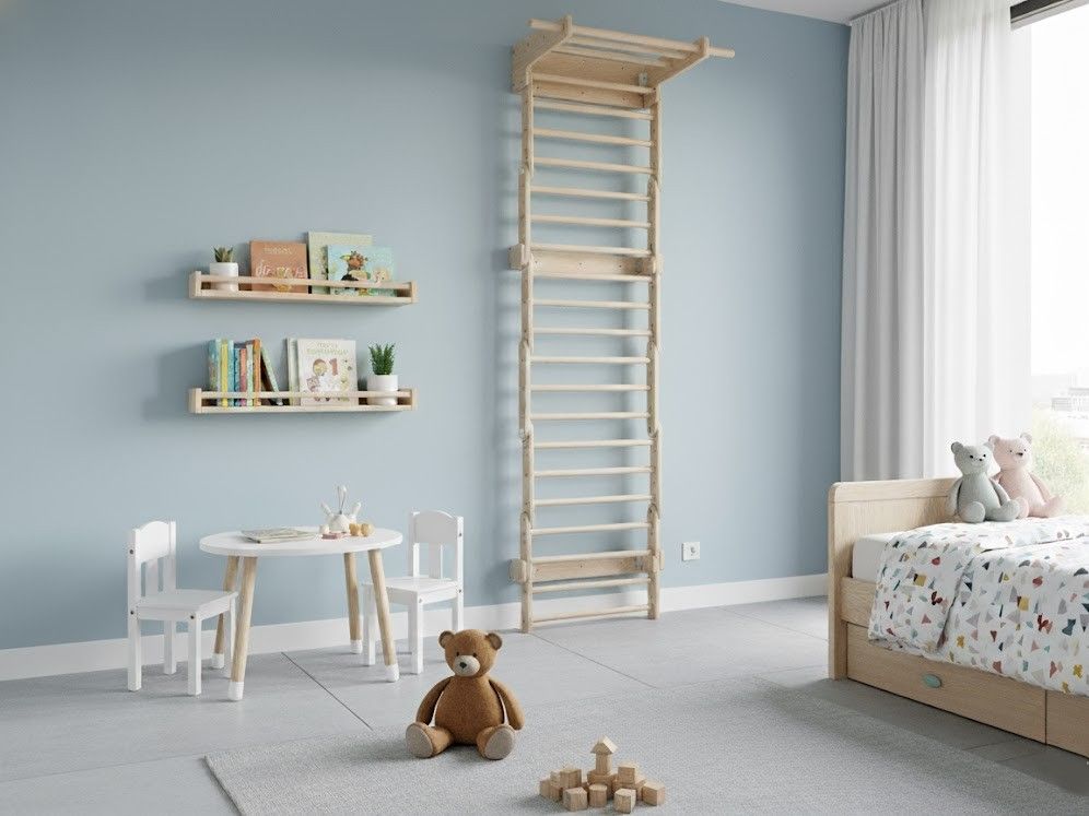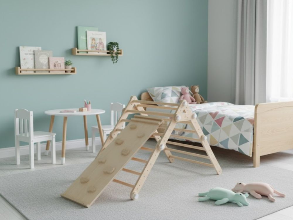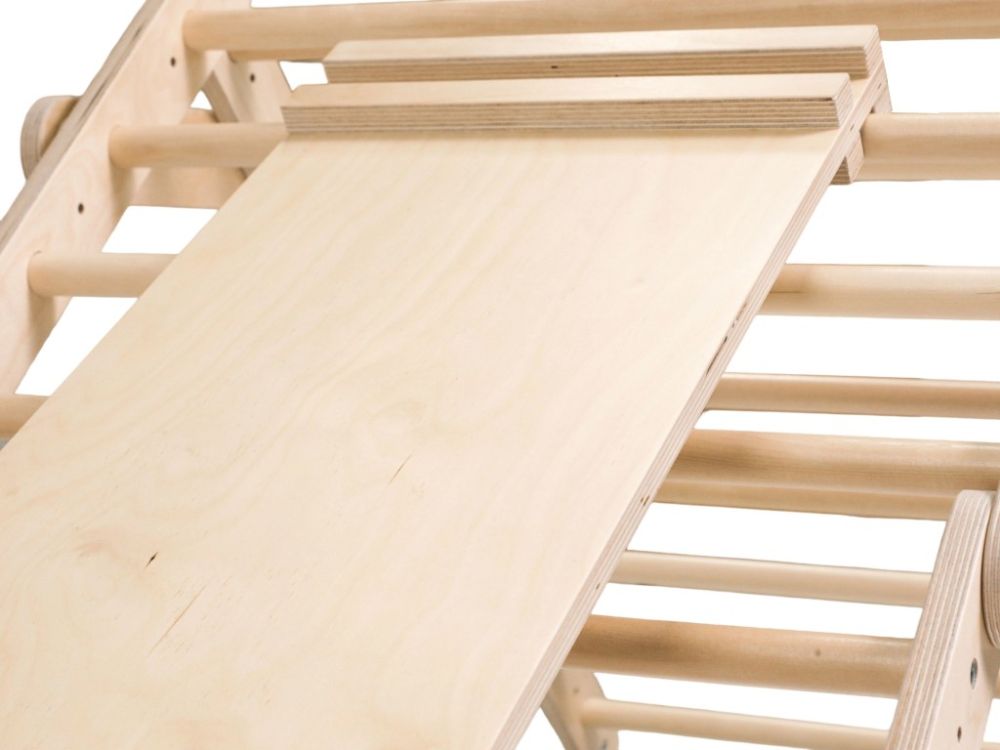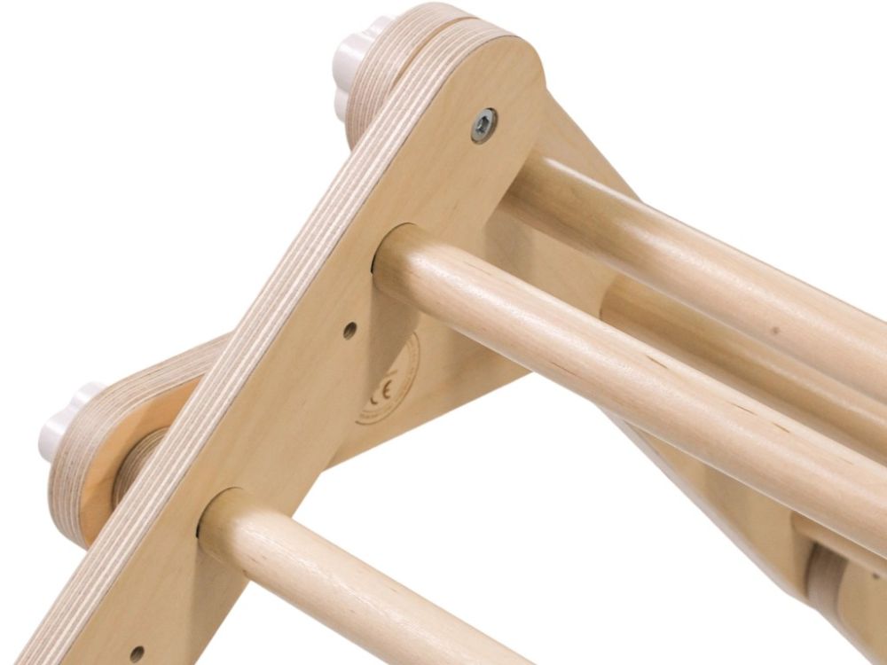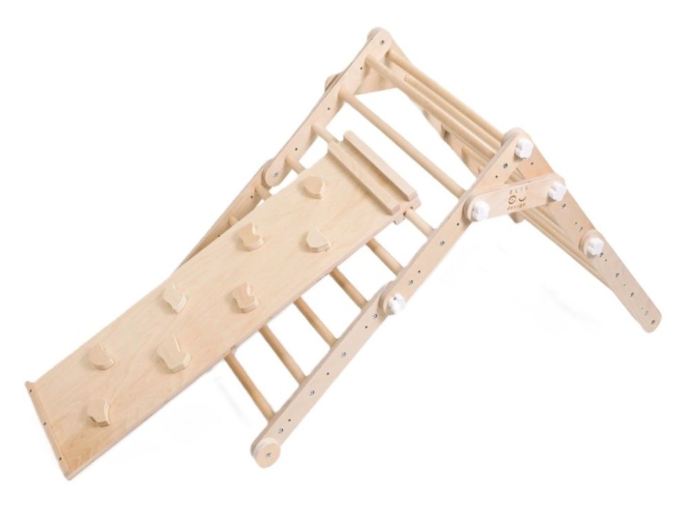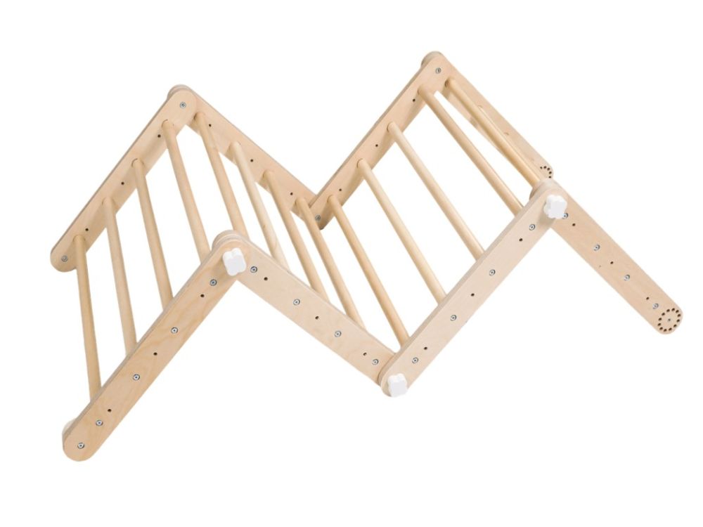 Varijabilno unutarnje vježbalište za djecu 3u1 kombinira Piklerov trokut s pločom (Dio A), Viseće ljestve s trapezom (Dio B) i Mini Piklerov trokut (Dio C) u jednu sigurnu i zabavnu cjelinu. Modularni dizajn omogućuje korištenje svakog dijela zasebno ili montiranje kompleta na zid, čime se u dječjoj sobi stvara pravi kućni poligon za penjanje i igru. Podržava razvoj motoričkih vještina, ravnoteže, koordinacije i snage te potiče samostalnost i aktivan način kretanja od najranije dobi.