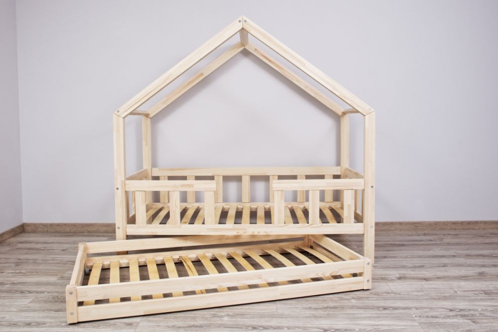 Fleksibilnost s nogicama i ladicom – kućica se može koristiti bez nogica ili nadograditi povišenim nogama i ladicom kao dodatnim ležajem ili spremištem, čime se Dječji krevet u obliku kućice (razne dimenzije) jednostavno prilagođava prostoru i potrebama obitelji.
