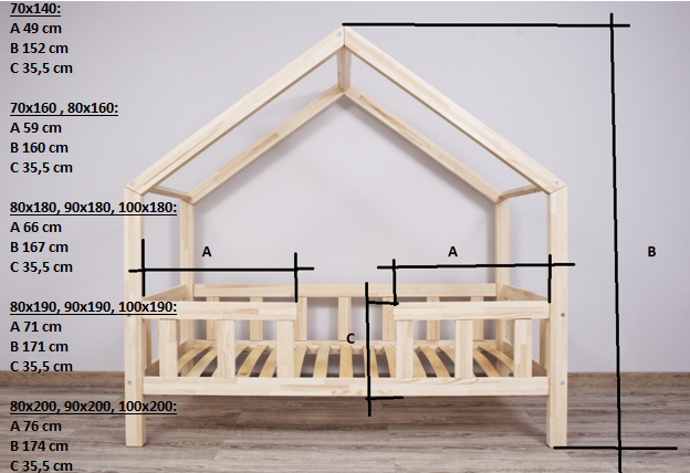 Razmak između okomitih letvica ogradice: 16 cm (ležajevi 70 × 140, 70 × 160 i 80 × 160 cm), 19 cm (sve ostale dimenzije)