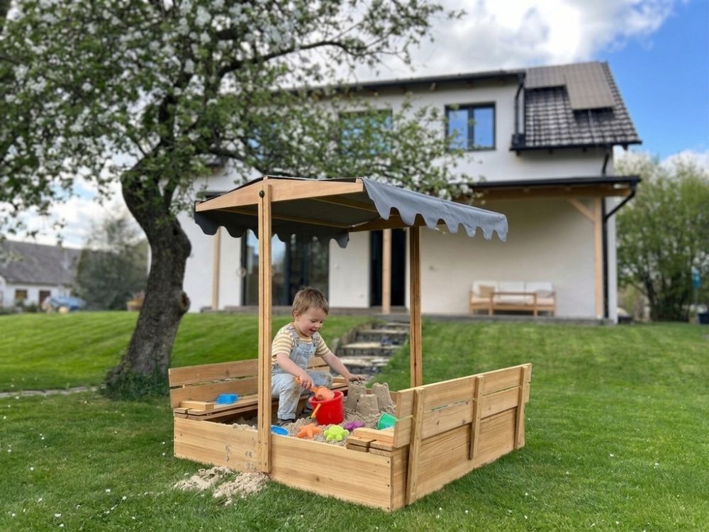Pješčanik s nadstrešnicom idealno je mjesto za igru na svježem zraku . Djeca kopaju po pijesku, rudare tunele, grade obore za životinje ili kuhaju razne poslastice. Praktična, podesiva nadstrešnica na drvenom pješčaniku štiti ih od lošeg ili jako sunčanog vremena tako da se mogu igrati vani gotovo bilo kada.