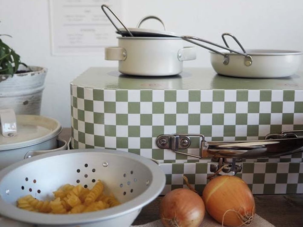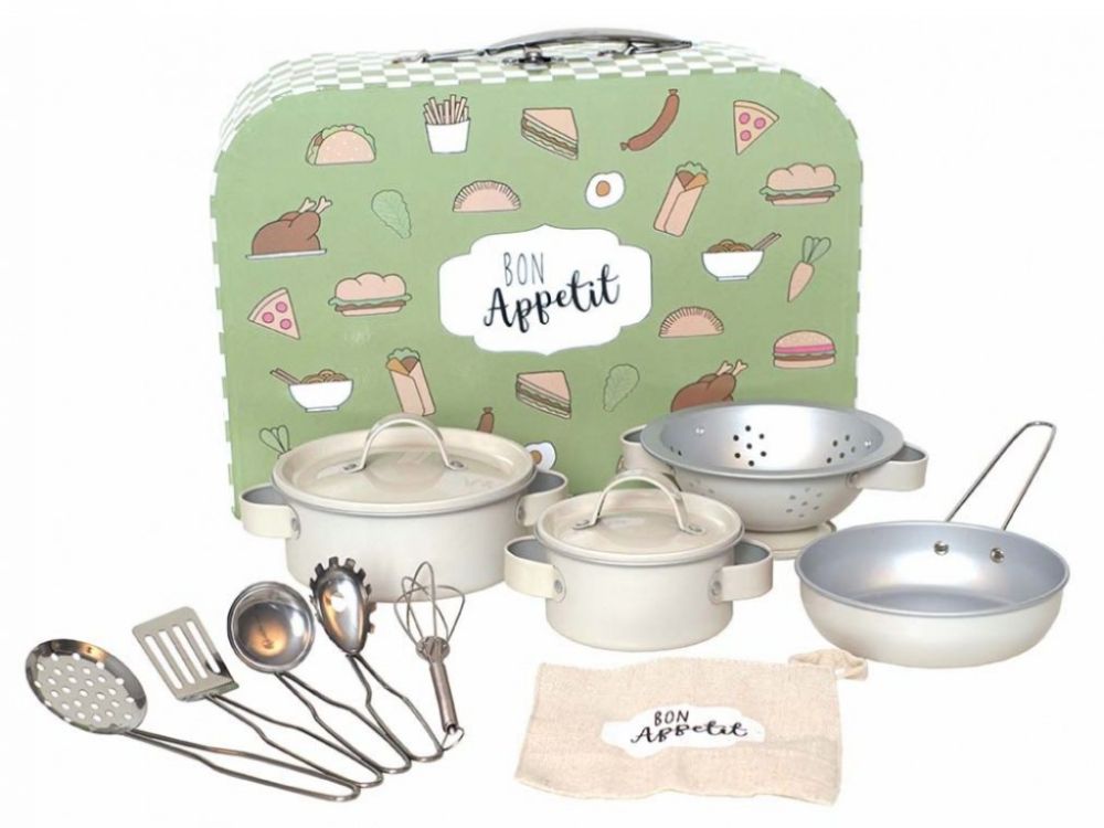 Pribor i pribor izrađeni su od nehrđajućeg čelika, tako da djeca mogu prati, brisati i vraćati svoj pribor u kutiju nakon jela. Višenamjenski kofer s priborom za kuhanje odlična je igračka za ponijeti sa sobom , jer sadrži sve što djeci treba za ovu popularnu igru.