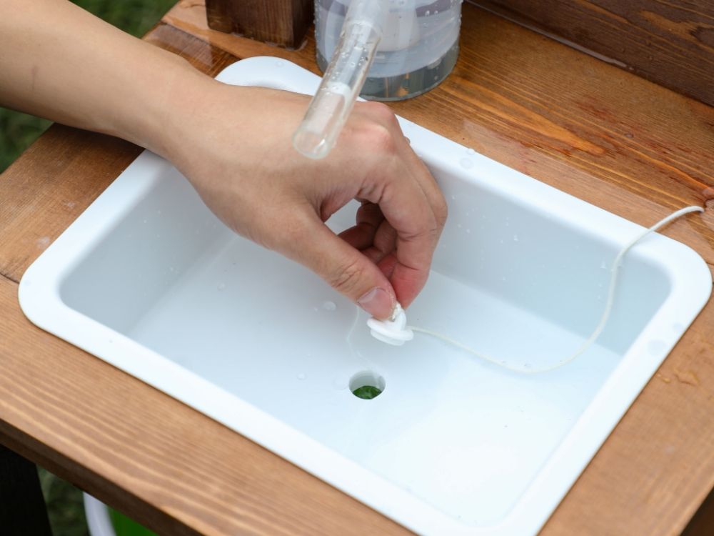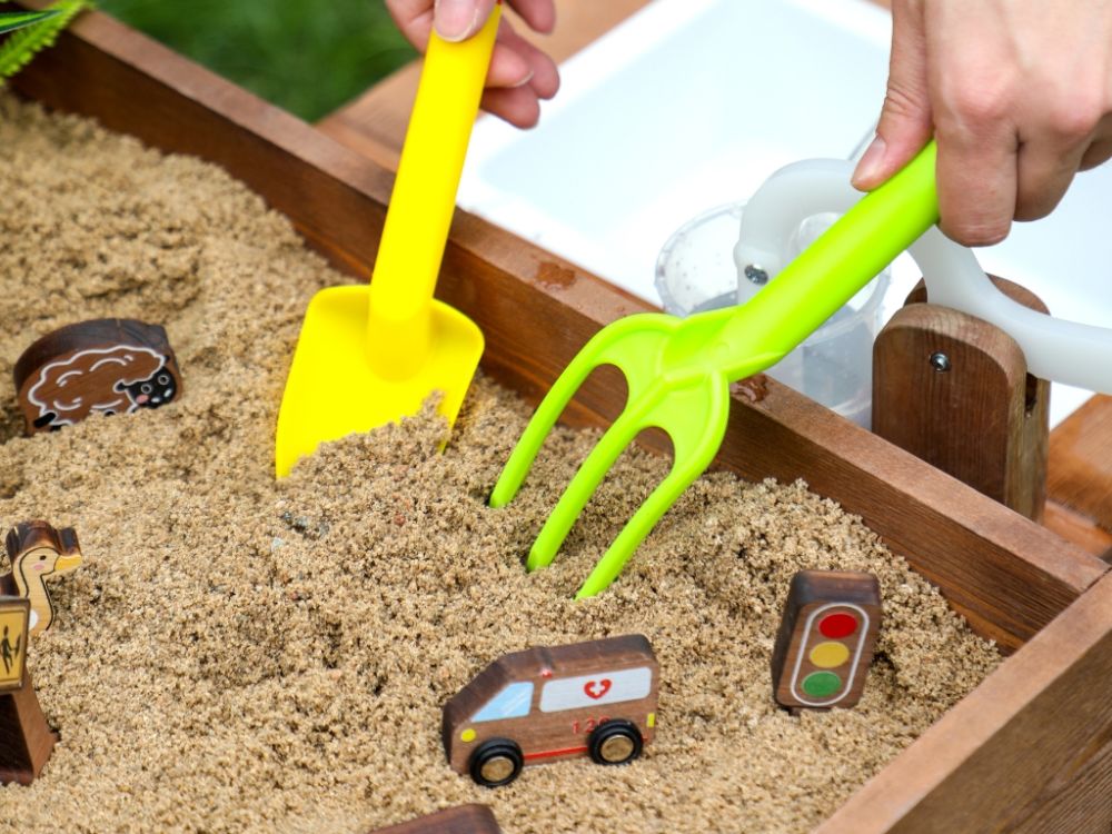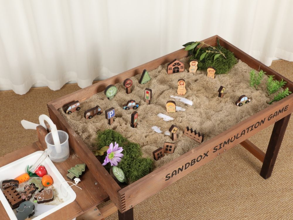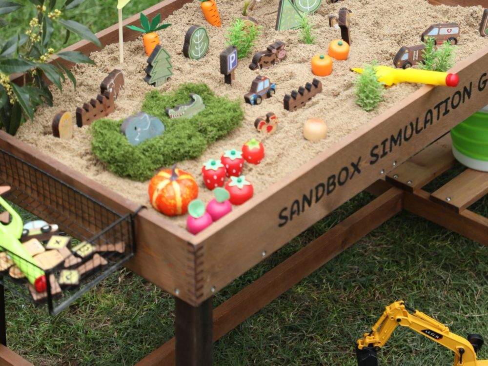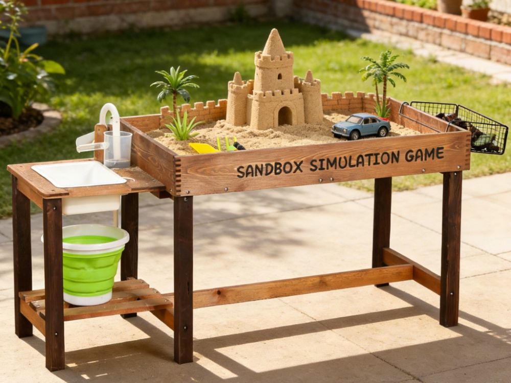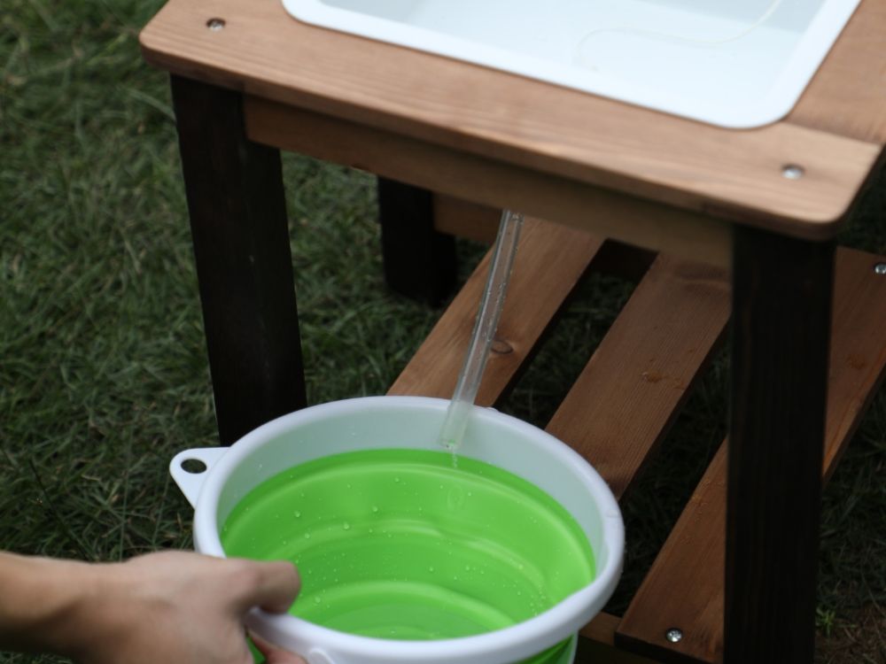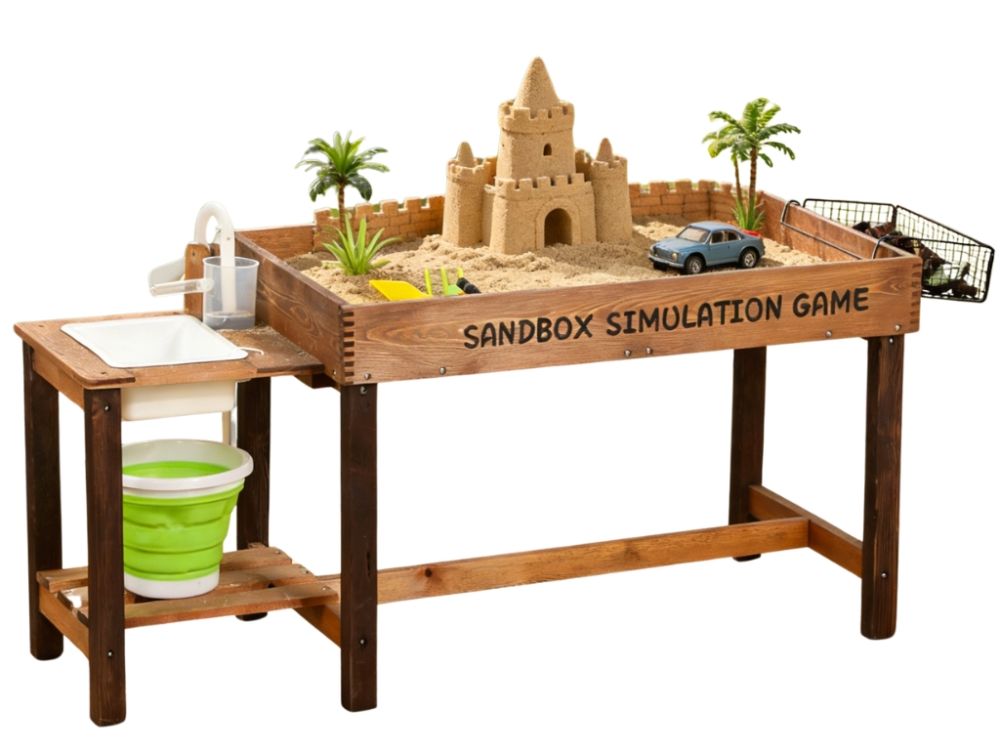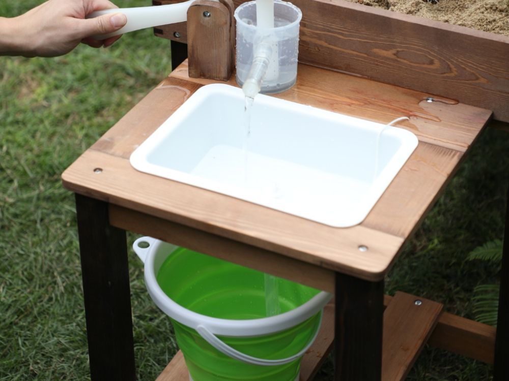 Visoki pješčanik praktičan je jer djeca mogu stajati tijekom igre, čime se sprječava prljanje njihove odjeće. Umivaonik s tekućom vodom služi za brzo ispiranje ruku od pijeska, pranje kalupa ili punjenje vode pri dječjem kuhanju ili miješanju maltera za gradnju u pješčaniku. Dio pješčanika je umivaonik s mogućnošću tekuće vode, s ispustom u sklopivi koferic, odlagačka košarica, lopatica i grablje.