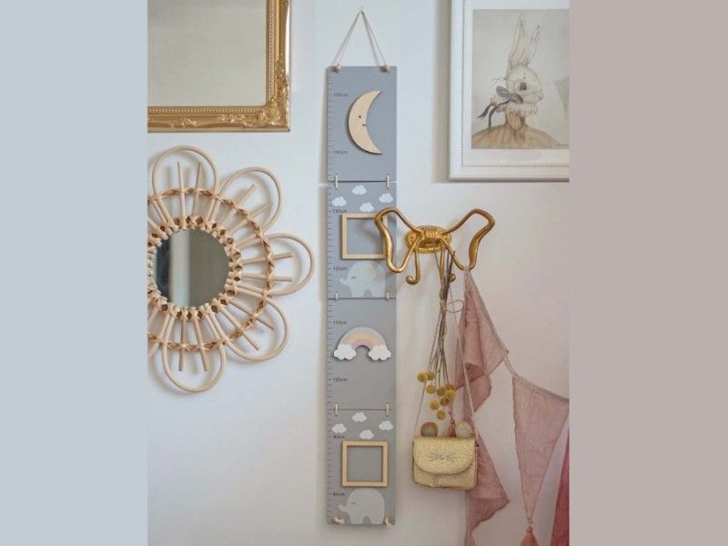Prekrasan ukras i praktičan dodatak svakoj dječjoj sobi je dječji drveni zidni metar u neutralnoj srebrnoj boji s modernim dječjim motivima . Slonovi, mjesec, oblaci i duge postat će ukras za svaku modernu sobu i zabavan alat za praćenje rasta vaše djece. Mjerač dolazi s dva okvira za omiljene fotografije.