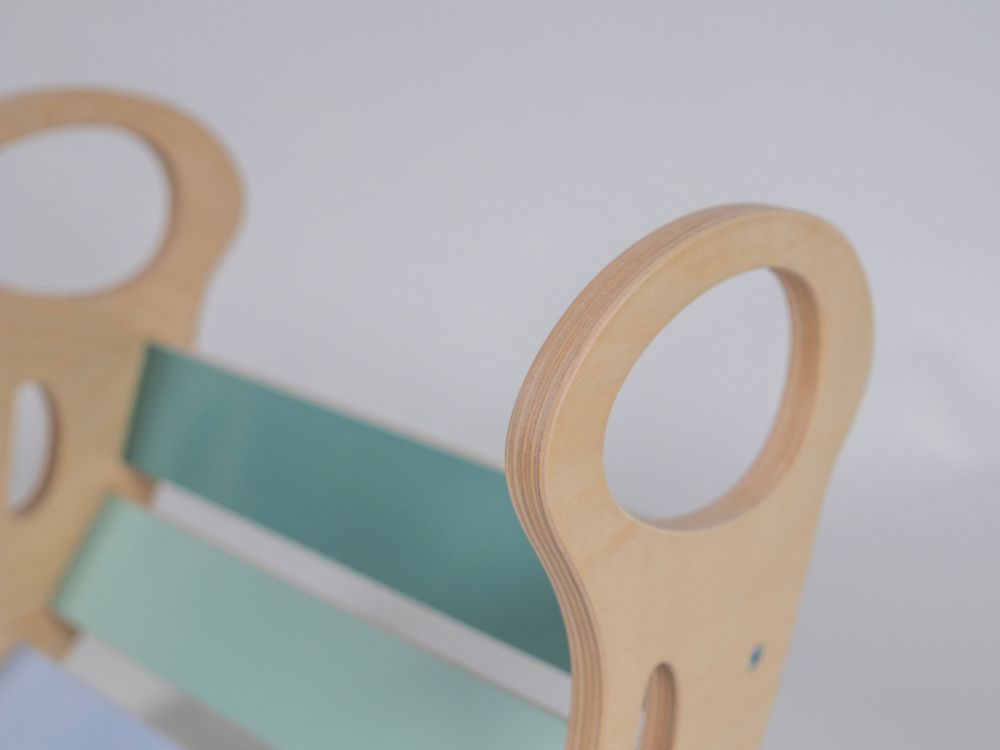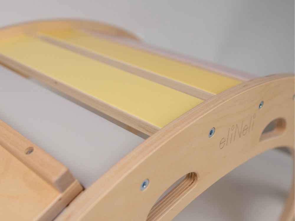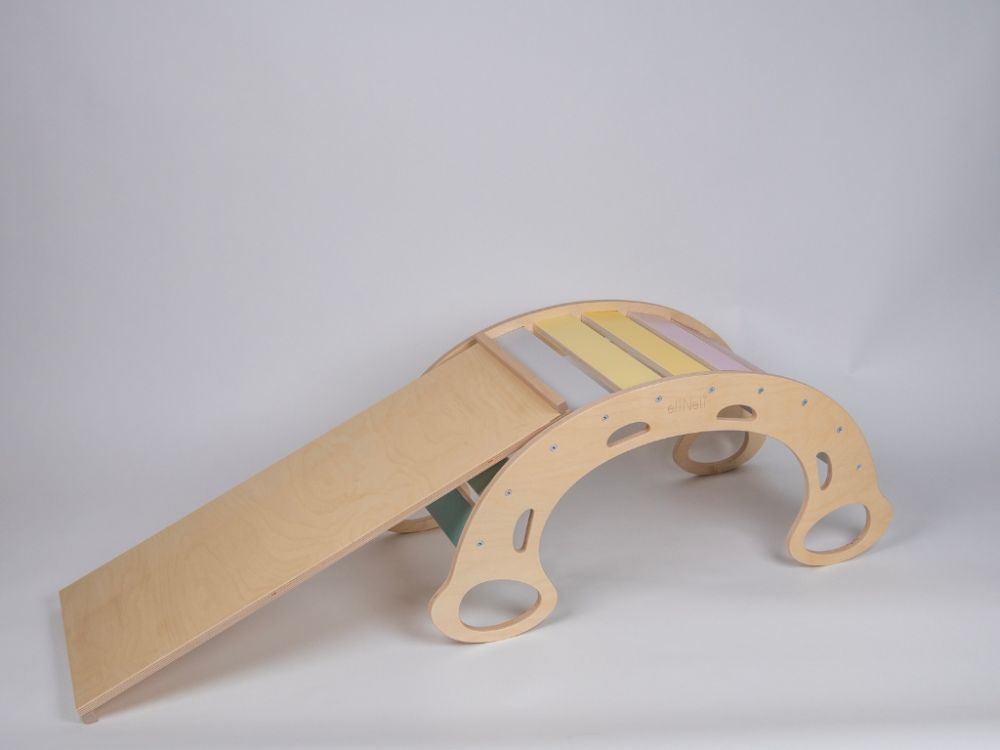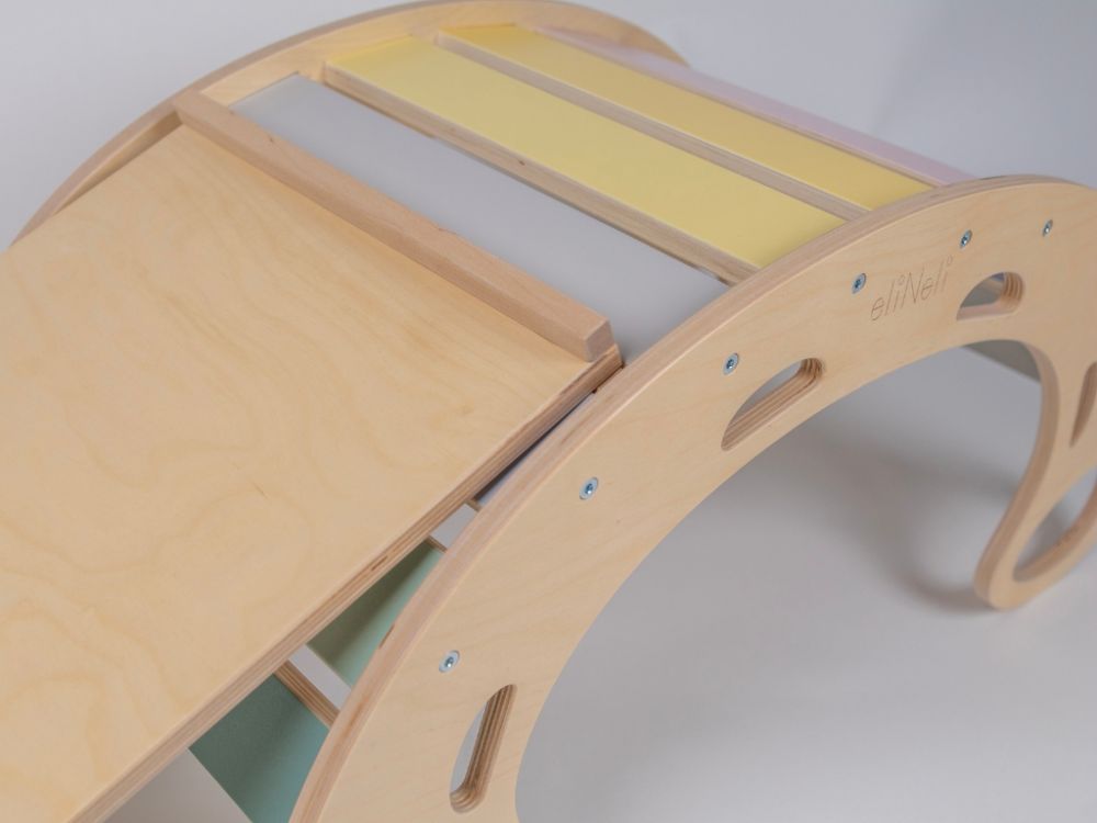 Napravite malo igralište u svom domu, brzo i jednostavno. Sve što trebate je ova nevjerojatna pastelna drvena ljuljačka 5-u-1 s dvostranom daskom - jedna strana je tobogan, a druga daska za penjanje. Drvena ljuljačka u šarenoj kombinaciji prirodnog drva i ugodnih pastelnih boja višenamjenska je igračka za dječju sobu koju djeca mogu koristiti i samostalno ne samo za pokretne igre. Na Montessori ljuljački djeca se mogu ljuljati ili samo ugodno opustiti uz lagano ljuljanje. Za maksimalnu udobnost nadopunite ljuljačku mekom navlakom . Ljuljačka je odlična kao penjalica, tobogan za unutrašnjost . Djeca se mogu popeti preko njega, zavući ispod njega, sakriti se ispod njega, klizati po njemu, sjediti na njemu ili ležati. Tijekom dječjih igara to može biti most, tunel, kuća i brojalica . Kada se spoji na dvostranu ploču , lako se pretvara u igralište na kojem se djeca mogu klizati ili penjati po strani s ručkama za penjanje. Uz pastelnu drvenu ljuljačku i dasku klinci će se dobro zabaviti , razgibati cijelo tijelo, ojačati mišiće i poboljšati motoriku.
