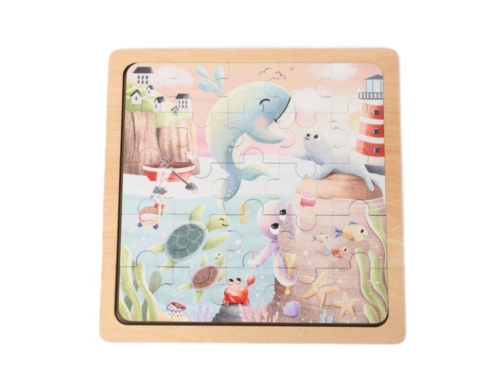 Drvena slagalica s motivom morskog svijeta oduševit će sve male istraživače podvodnog života. Visokokvalitetni drveni dizajn jamči sigurnu i zabavnu igru koja razvija finu motoriku i logičko razmišljanje. Idealna edukativna igračka za djecu od 2 godine , prikladna kao originalan poklon za svaku prigodu.