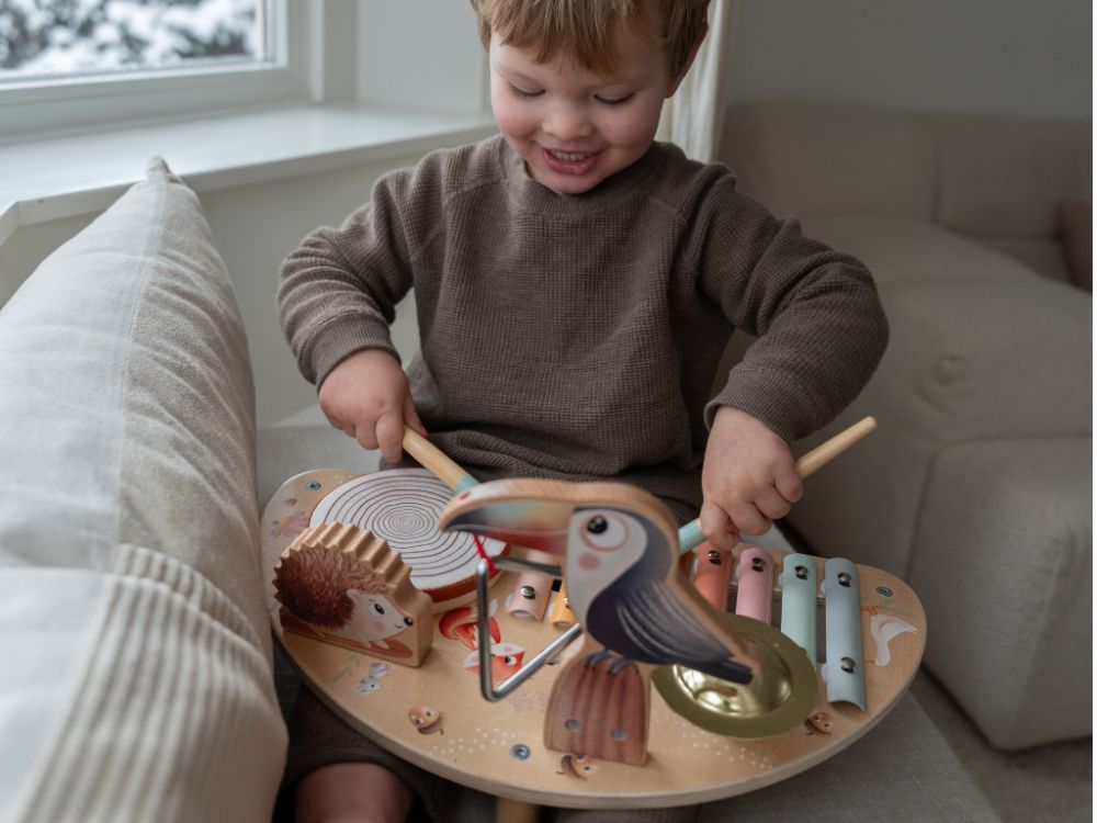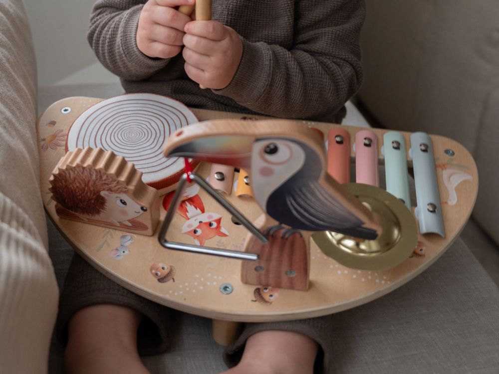 Glazbeni stolić s setom glazbenih instrumenata očarat će svaku djevojčicu i dječaka svojim dizajnom, bojama i slatkim motivom životinja . Originalni glazbeni stolić probudit će ljubav prema glazbi u svakom djetetu. Stolić s glazbenim instrumentima unijet će radost u svaku dječju sobu i neće djeci dosaditi - mogu svirati nekoliko glazbenih instrumenata. Mogu pronaći ksilofon, činelu, bubanj, triangle ili palice za bubanj. Posjedovanje omiljenih glazbenih instrumenata na jednom mjestu omogućuje djeci da prirede mali koncert za svoje lutke, plišane životinje, roditelje ili prijatelje. Djeca će učiti o glazbenim instrumentima, kako ih svirati i koje zvukove proizvode, stimulirati svoja osjetila, poboljšati finu motoriku, igrati uloge i razvijati maštu.