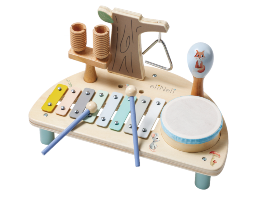 Ovaj glazbeni stol uključuje pet osnovnih instrumenata koji djeci omogućuju da istražuju svijet zvukova i ritma.