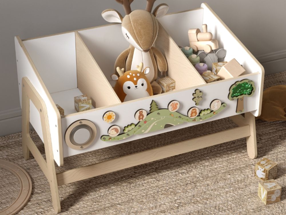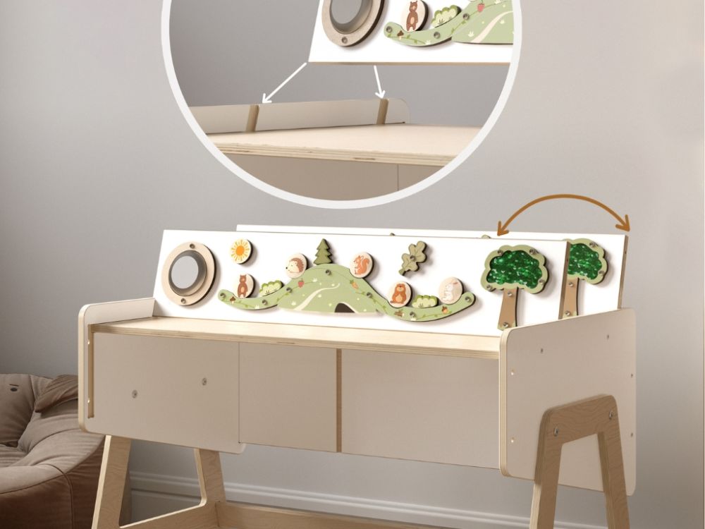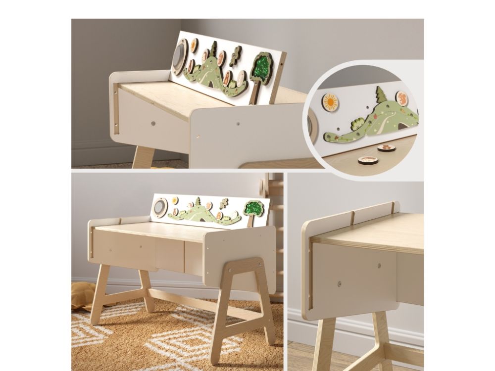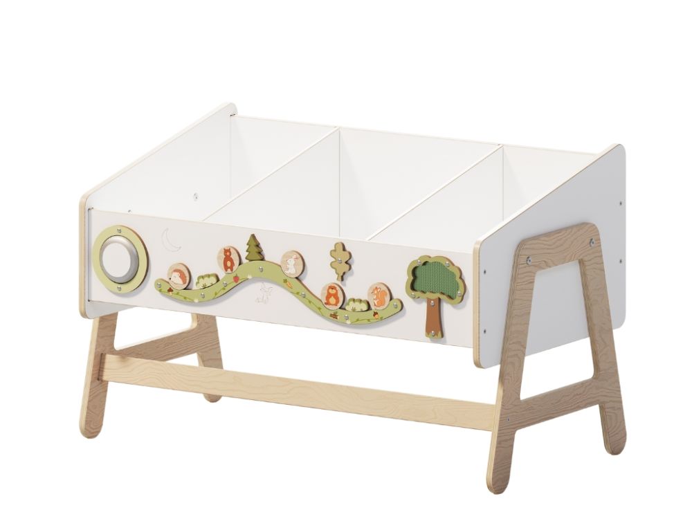 Polica za igračke i stol u jednom modularni je komad namještaja koji djeci nudi prostor za pohranu, mjesto za igru i radnu površinu. Multifunkcionalni dizajn i ploča za igru potiču samostalnost, kreativnost i razvoj fine motorike.