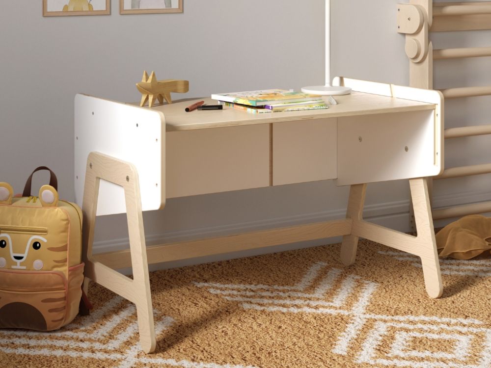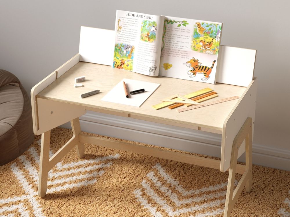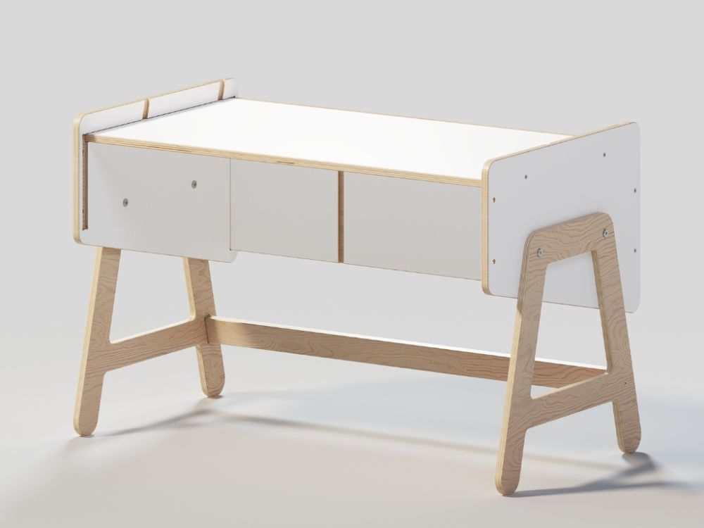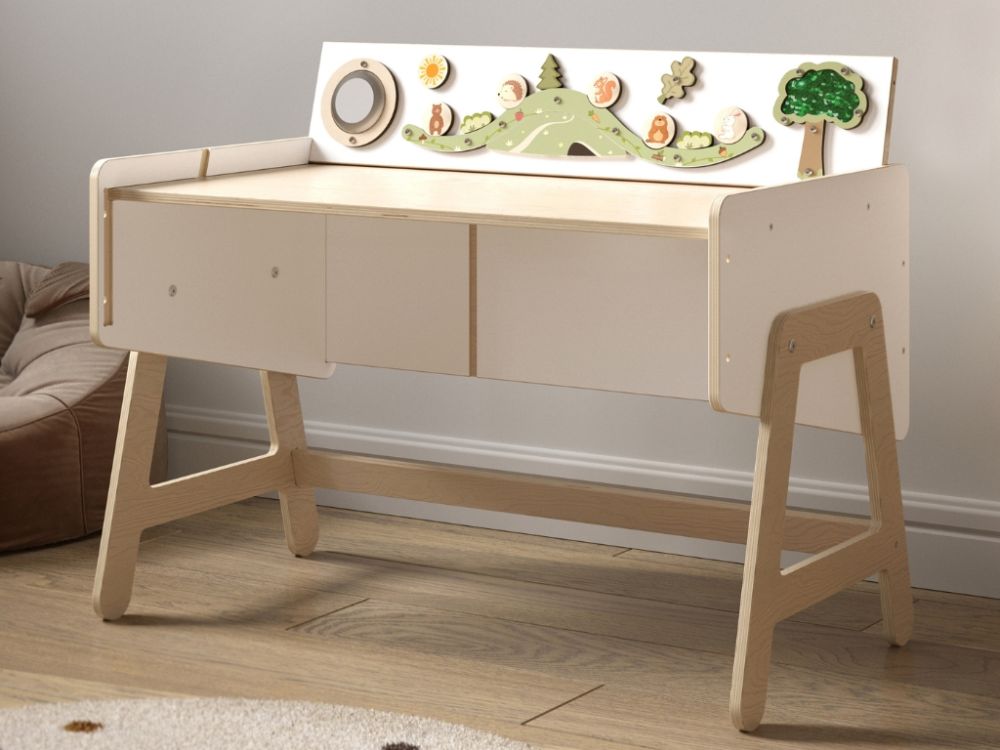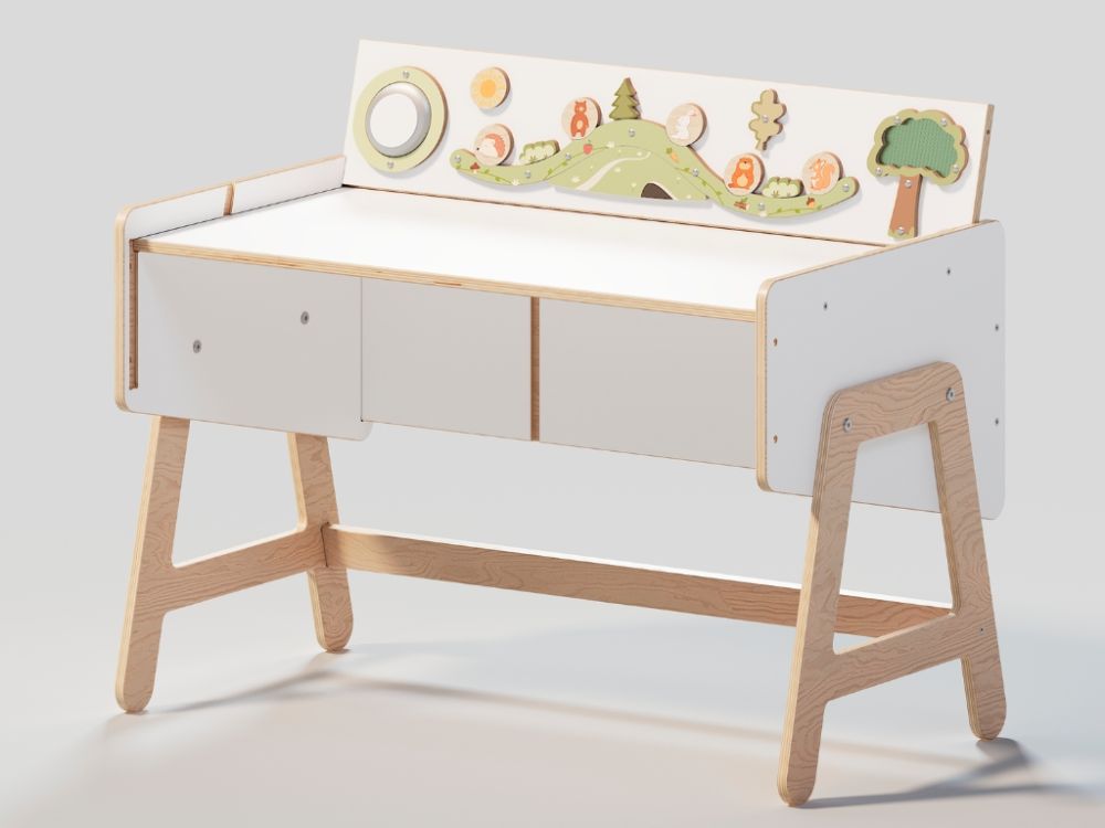 Polica za igračke i stol u jednom modularni je komad namještaja koji djeci nudi prostor za pohranu, mjesto za igru i radnu površinu. Multifunkcionalni dizajn i ploča za igru potiču samostalnost, kreativnost i razvoj fine motorike.