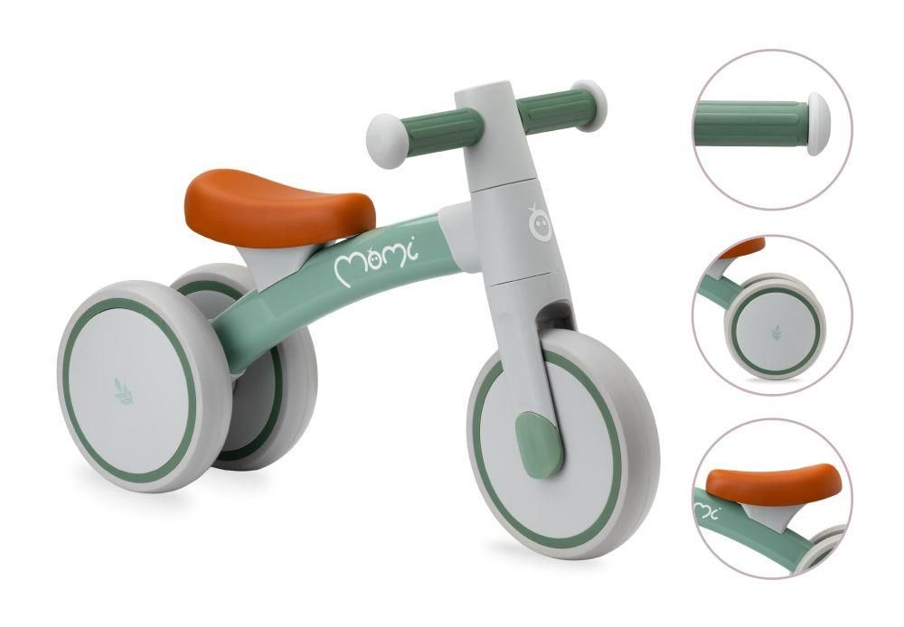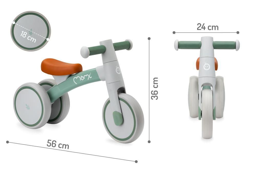 MoMi TEDI mini bicikl za ravnotežu zeleni prvi je dječji model namijenjen najmlađima. Pomaže u razvoju ravnoteže i motorike kroz igru te je prikladan za djecu od 1 godine koja već samostalno hodaju. Lagan i stabilan dizajn omogućuje sigurnu vožnju u zatvorenom i na otvorenom.