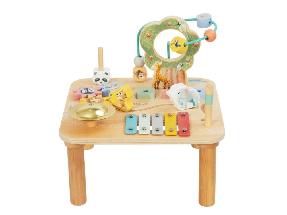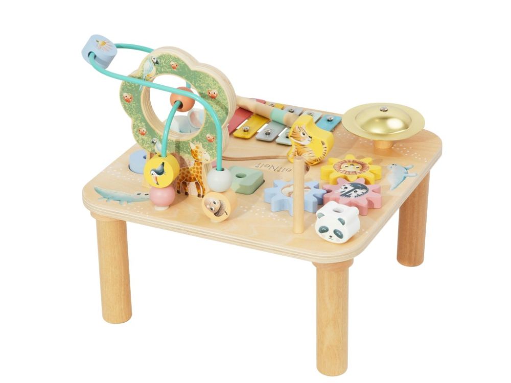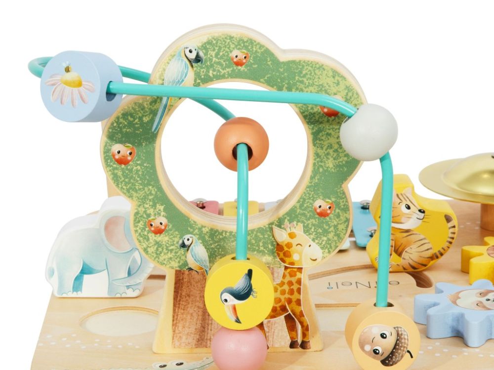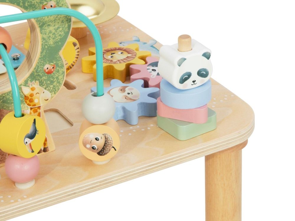 Drveni motorički stol u šarenoj kombinaciji prirodnog drva s prekrasnim pastelnim bojama nudi djeci mnoštvo mogućnosti za igru, usavršavanje vještina i učenje novih. Aktivni stol zabavljat će djecu satima i prikladan je za pojedince i grupe. Na aktivnom stolu djeca će pronaći razne aktivne elemente na jednom mjestu - cool labirint od perli , igru slaganja pande , zupčanike sa životinjama, slagalicu s različitim geometrijskim oblicima, labirint i glazbene instrumente koji će vaše dijete pretvoriti u malog glazbenika.