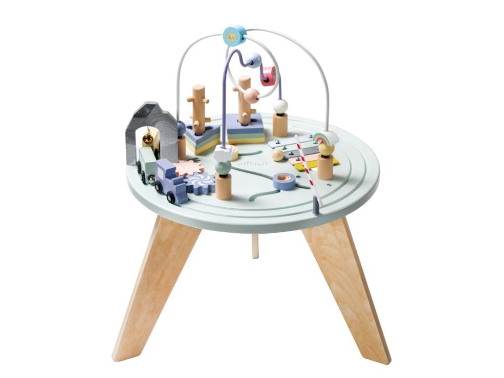 Na stolu se nalaze: željeznička pruga s vlakom, barijera i tunel sa zvončićem, labirint s perlicama, slagalica oblika, zupčanici, labirint sa šumskim životinjama i ksilofon.