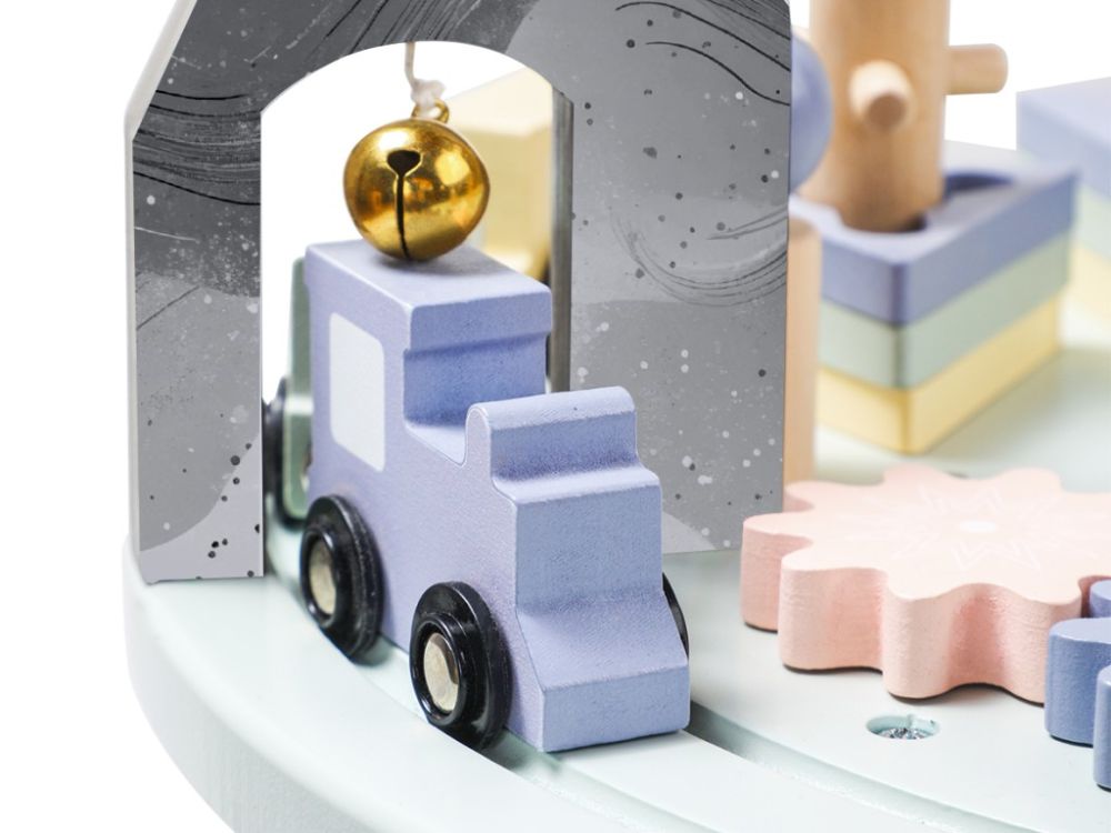 Na stolu se nalaze: željeznička pruga s vlakom, barijera i tunel sa zvončićem, labirint s perlicama, slagalica oblika, zupčanici, labirint sa šumskim životinjama i ksilofon.