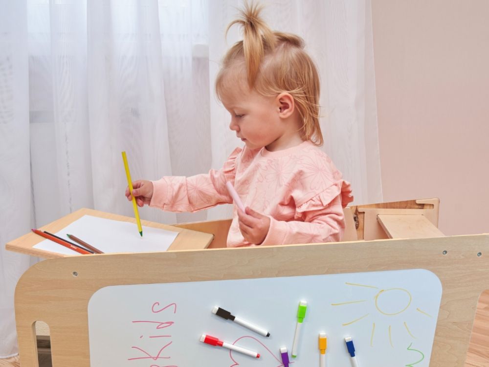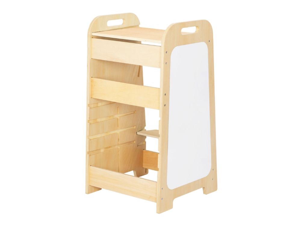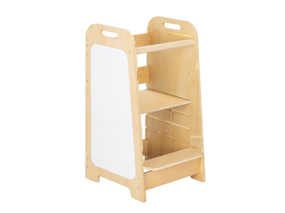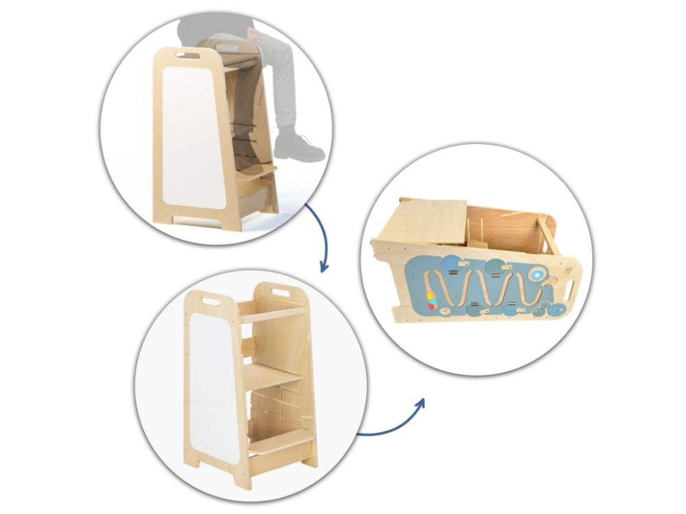 5-u-1 toranj za učenje izrađen od izdržljive brezove šperploče raste s vašim djetetom zahvaljujući 4 podesive visine i može se brzo pretvoriti u praktičan stol i stolicu . Elementi za igru i activity ploča potiču kreativnost i samostalnost.