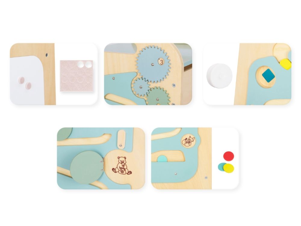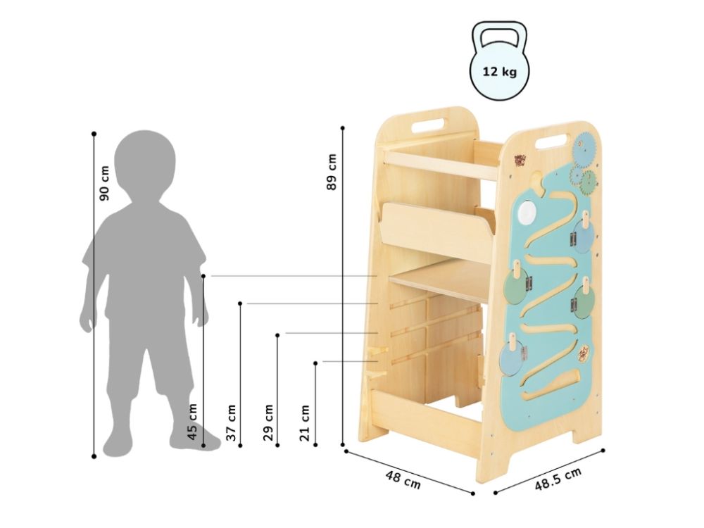 Rastući Montessori toranj za učenje 5u1 Play 89cm - mint osmišljen je kako bi djeci na prirodan način pomogao u učenju i igri. Ugrađeni igraći panel i bočna bijela ploča za pisanje flomasterima potiču razvoj fine motorike, koordinacije ruke i oka te logičkog razmišljanja.