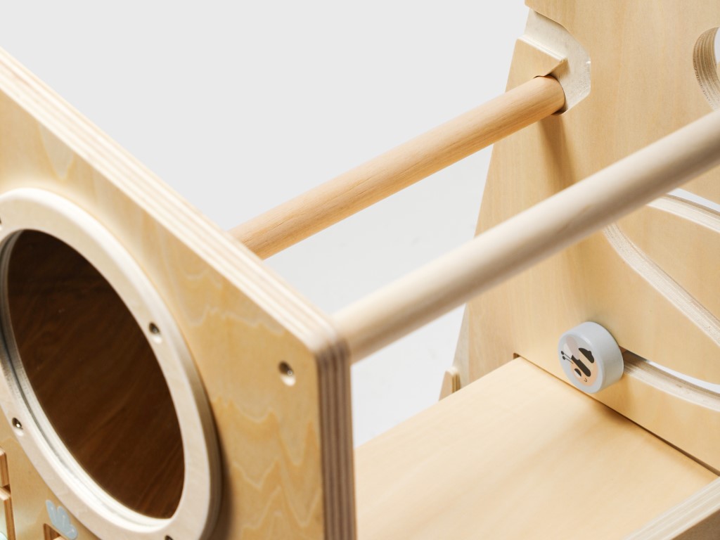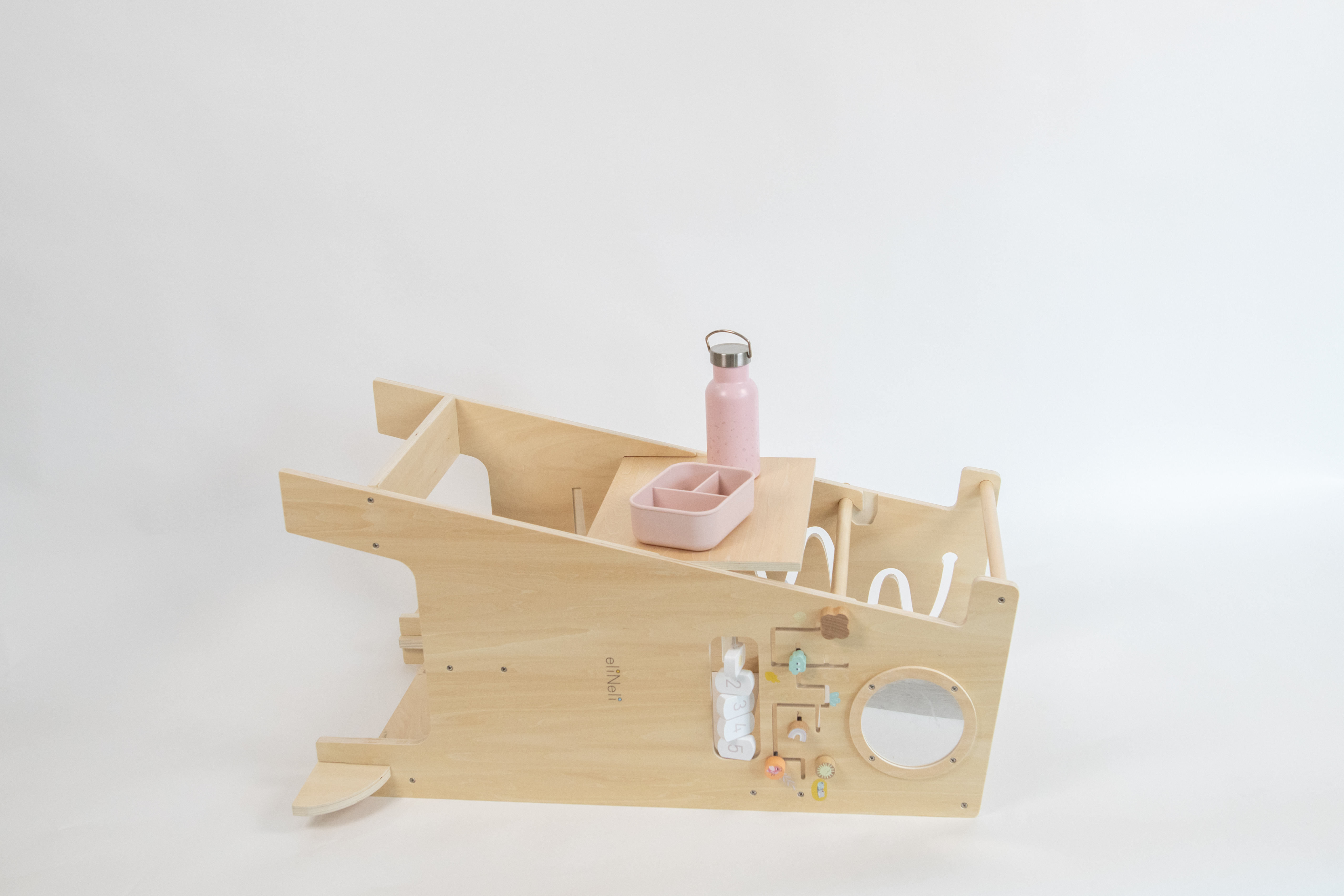 Izrađen od čvrste šperploče (15 mm) i obojen lakovima na bazi vode. Dodane su nove sigurnosne značajke: stabilizacijske noge, potpore ispod platforme, barijera i stol koji se može učvrstiti. Visoki bočni zidovi i zaštitne prepreke sprječavaju padove, a platforma se prilagođava na 3 visine (30, 40, 50 cm) za djecu od 1 do 6 godina.