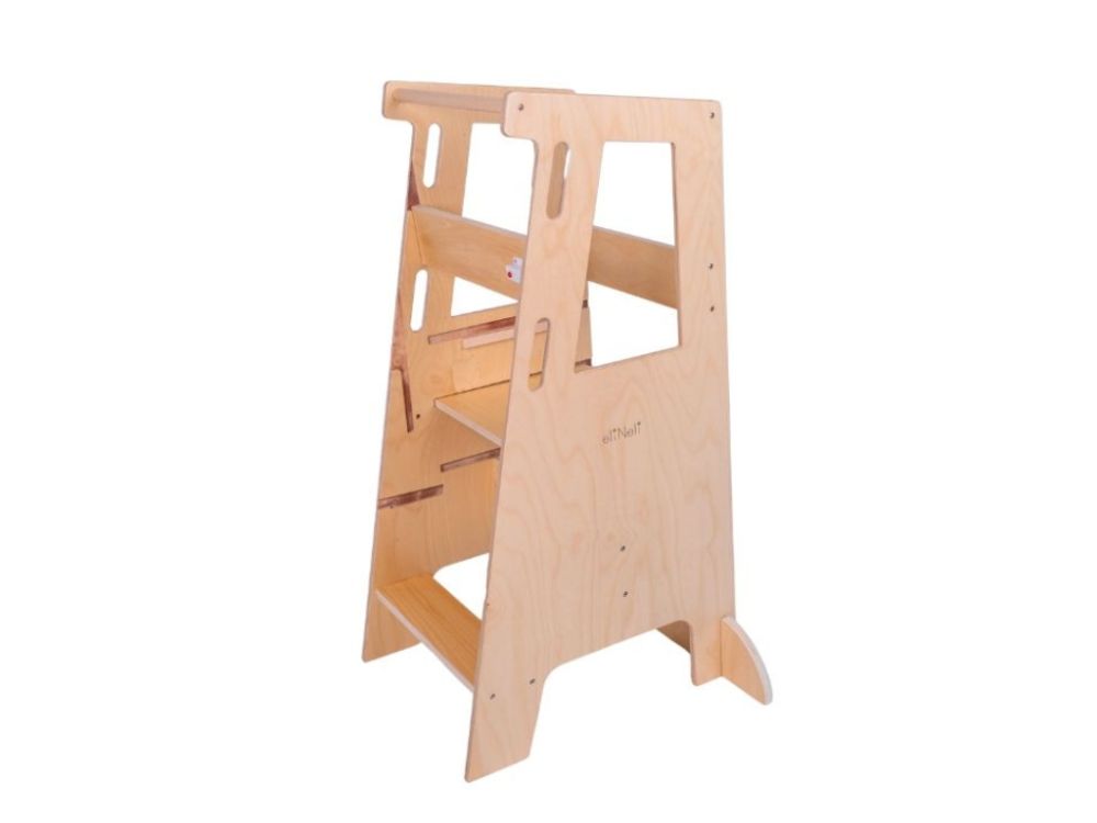 Rastući toranj za učenje 3u1 višenamjenski je komad dječjeg namještaja koji djeci pomaže da se sigurno popnu na potrebnu visinu, promatraju, otkrivaju, usavršavaju svoje vještine, uče. Rastući toranj za učenje 3u1 - stepenice + toranj za učenje + set dječjeg namještaja (stol + stolica), s podesivom platformom na 3 razine, prilagođava se visinom svakom djetetu od 1 do oko 6 godina. Zahvaljujući tornju za učenje djeca postaju dio kuhinjskih poslova, mogu se uključiti u rad u kuhanju, pripremi hrane ili prskanju, mogu provoditi više vremena sa svojim roditeljima . Toranj za učenje za djecu odličan je ne samo u kuhinji, već iu dječjoj sobi ili kupaonici, gdje vodi djecu do samostalnosti .