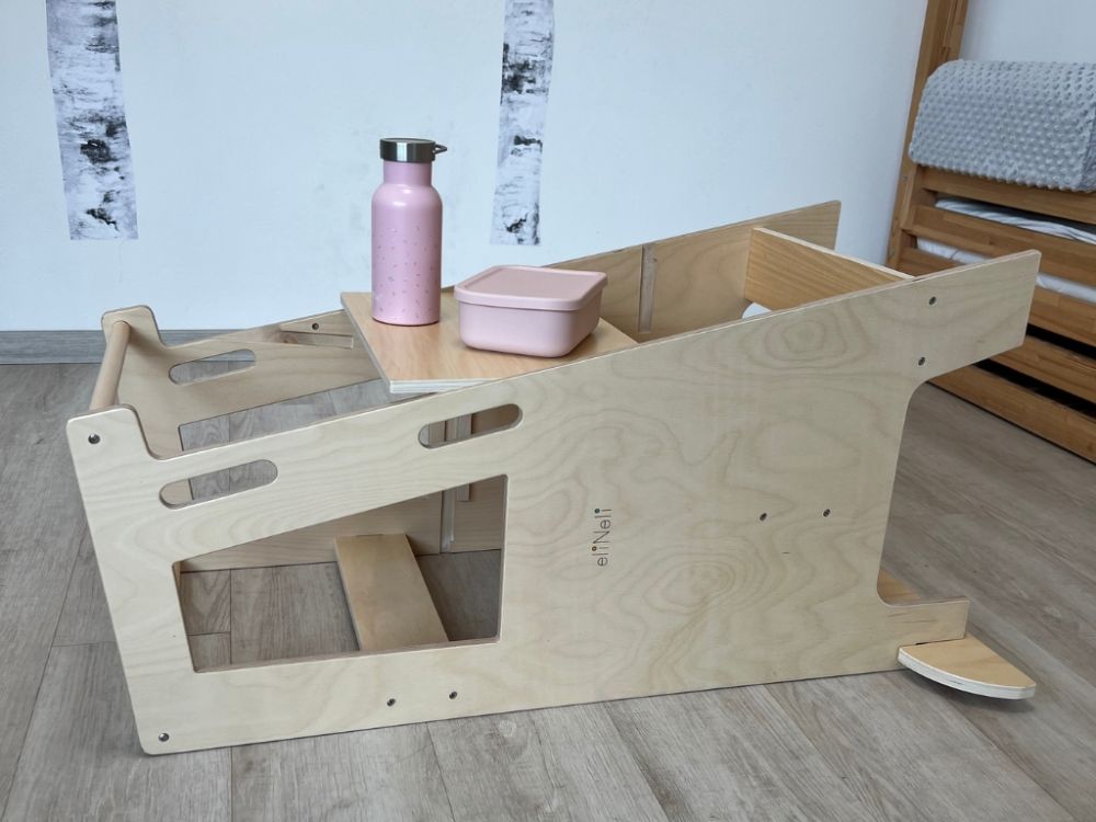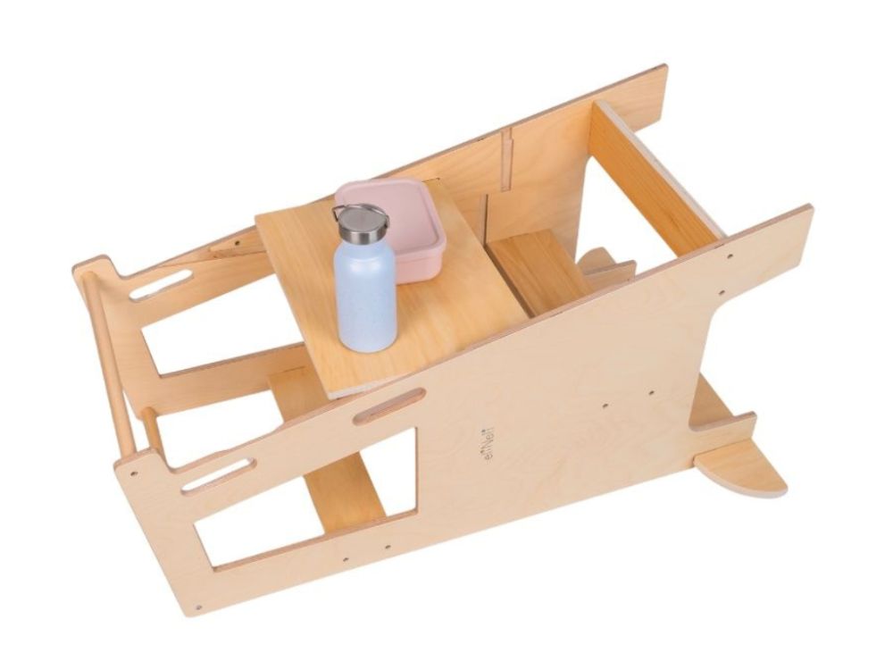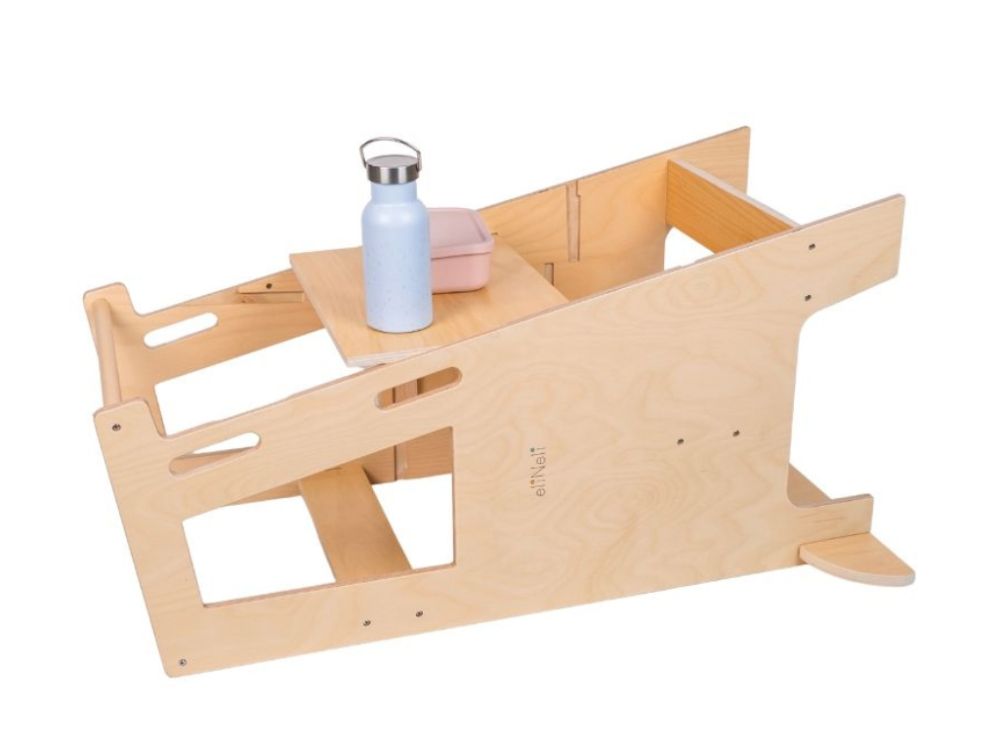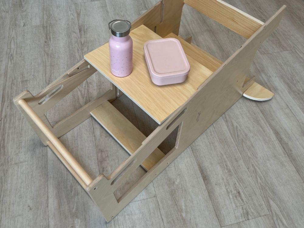 Ovaj svestrani pomoćnik lako se pretvara u dječji stol i stolicu za kojima djeca mogu stvarati i grickati. Jednostavno postavite rastući toranj za učenje unatrag na pod i pomaknite platformu na kojoj djeca stoje u tornju za učenje. Platforma služi kao ploča stola.