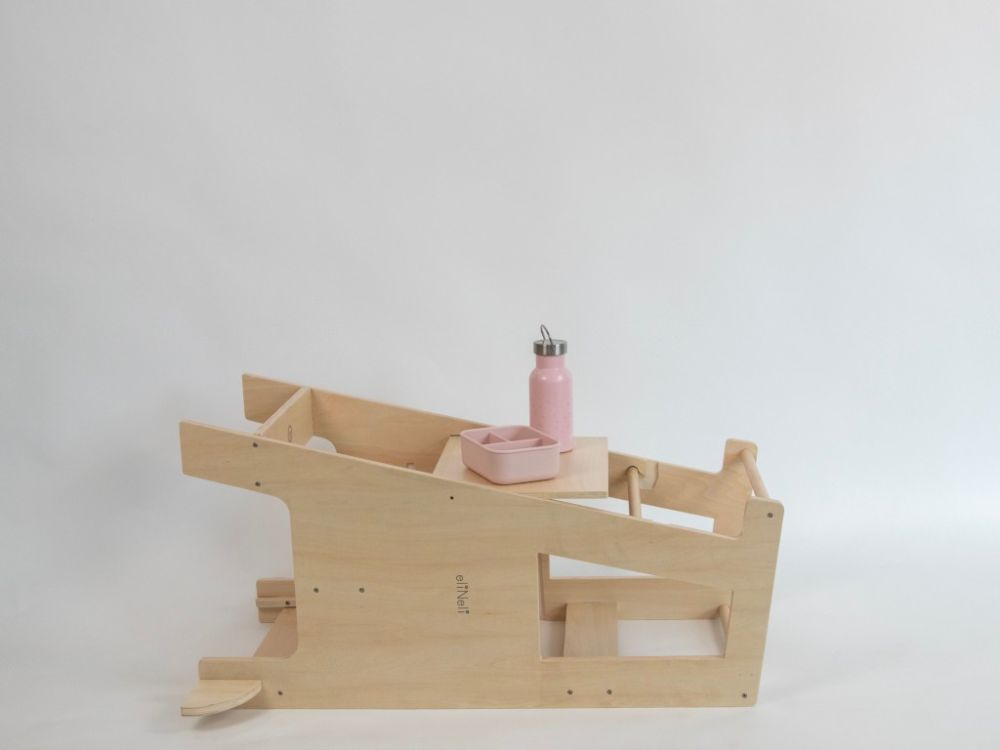 Rastući toranj za učenje 3u1 sa stabilizacijom - od bukve omogućuje djetetu da sigurno sudjeluje u svakodnevnim aktivnostima u kuhinji, kupaonici ili dječjoj sobi. Zahvaljujući stabilizacijskim nožicama, zaštitnim bočnim stranicama i čvrstoj konstrukciji, dijete ima siguran oslonac pri svakom penjanju i stajanju. Podesiva visina platforme prati rast djeteta, a jednostavna transformacija u stolić i stolicu produžuje korisnost proizvoda kroz više razvojnih faza.