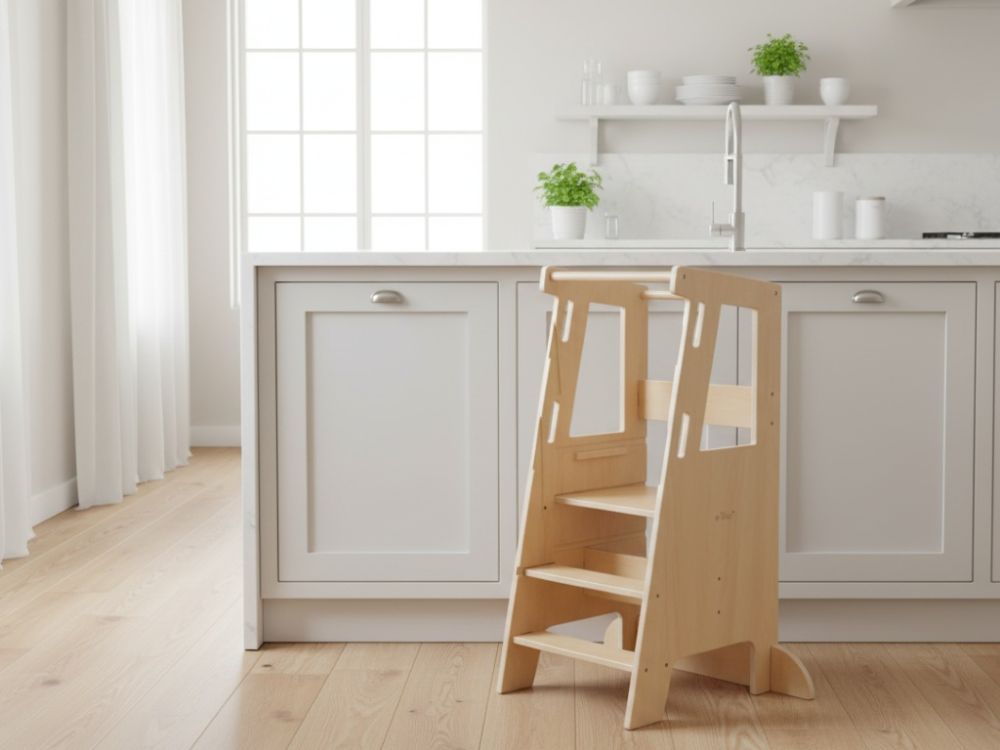 Rastući toranj za učenje 3u1 sa stabilizacijom - od bukve osmišljen je kao siguran pomagač u svakodnevnim obiteljskim ritualima – od pripreme obroka, preko pranja ruku, do kreativnih aktivnosti za kuhinjskim pultom ili stolom. Stabilizacijski elementi i zaštitne stranice povećavaju sigurnost pri penjanju i stajanju, dok UV zaštitni premaz omogućuje da se površina brzo očisti vlažnom krpom i ostane uredna za svakodnevnu upotrebu.