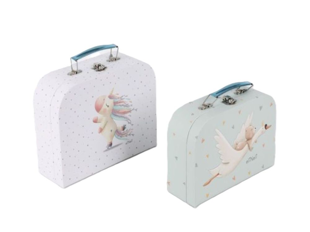 Set dječjih kofera s motivom bajkovitog jednoroga i gusana koji nosi medvjedića oduševit će svojim nježnim i razigranim dizajnom. U setu se nalaze dva kofera različite veličine – savršena kombinacija za spremanje dječjih sitnica, suvenira ili igračaka.