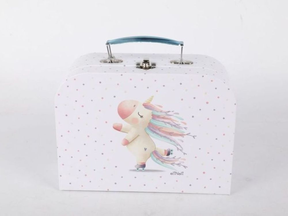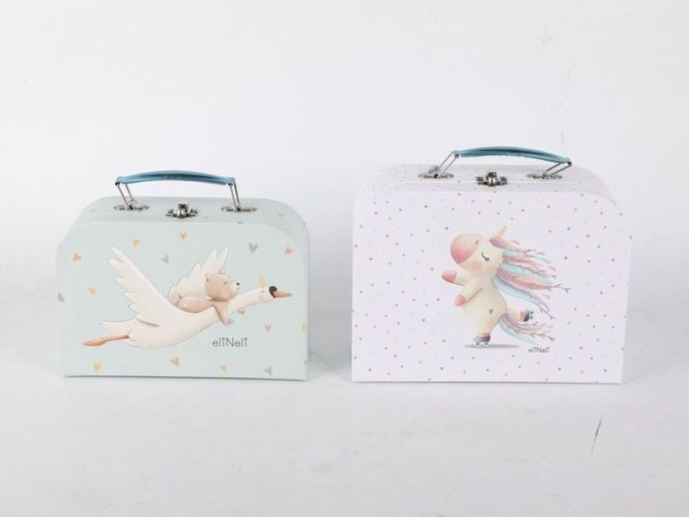 Set dječjih kofera s motivom bajkovitog jednoroga i gusana koji nosi medvjedića oduševit će svojim nježnim i razigranim dizajnom. U setu se nalaze dva kofera različite veličine – savršena kombinacija za spremanje dječjih sitnica, suvenira ili igračaka.