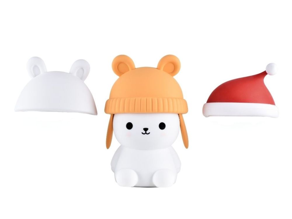 Silikonska lampa medvjedić s 3 zamjenjive kape. RGB promjena boja dodirom, daljinsko upravljanje, baterija 1200mAh. Sigurna za djecu od 3 godine.