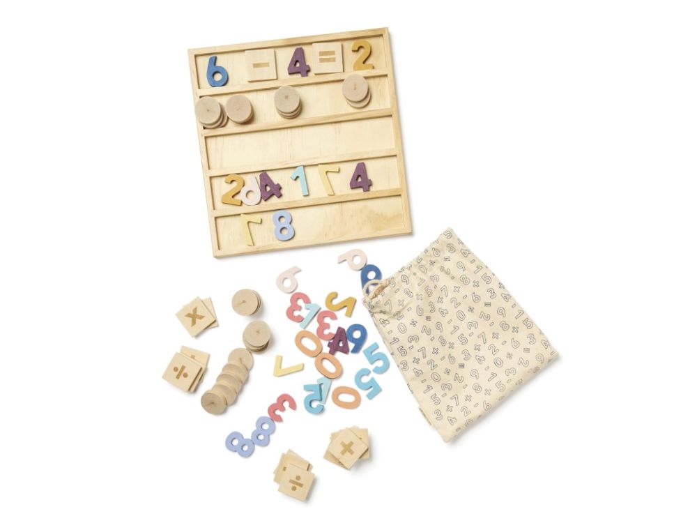Sada je još zabavnije razumjeti matematiku . Jednostavno okrenite ploču za 90 stupnjeva i dobit ćete retke ili stupce po potrebi. Na primjer, okrugli drveni dijelovi mogu predstavljati 1, 10 ili 100, ovisno o tome na kojoj ste razini brojanja. Za mlađu djecu, mogu se koristiti za izračunavanje koliko jabuka mama dobiva, a koliko tata, na primjer. Jedino ograničenje je vaša mašta. Pojedinačni dijelovi također olakšavaju razumijevanje kako je sve povezano, jer ih možete fizički pomicati naprijed-natrag dok ne pronađete pravo rješenje. Naravno, tu su i brojevi i matematički znakovi koji pokazuju kako izgledaju zbrajanje, oduzimanje, dijeljenje i množenje . Kada završite s računanjem , sve dijelove možete pohraniti u priloženu platnenu vrećicu . Ova fleksibilna i edukativna igračka idealna je za mlađu djecu koja su zainteresirana za brojeve i jednostavnu aritmetiku ili za mlađu školsku djecu.