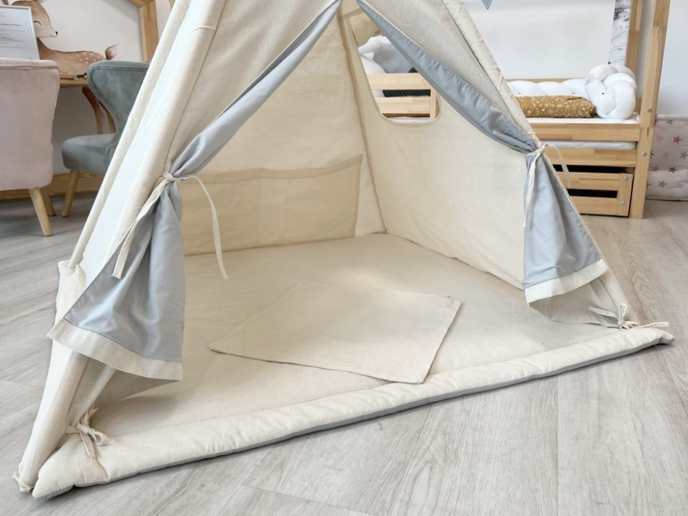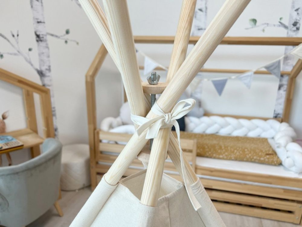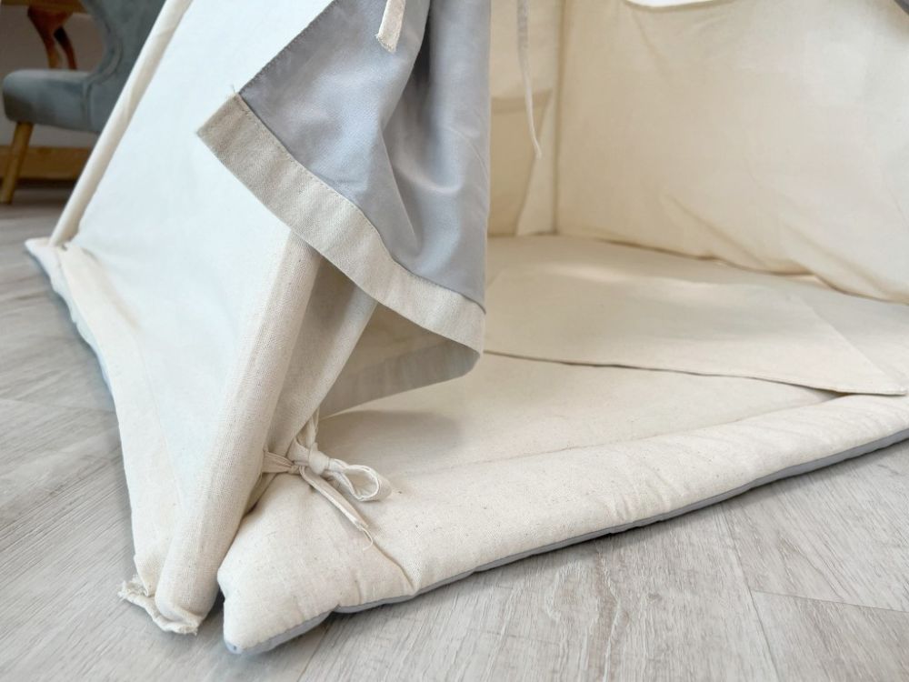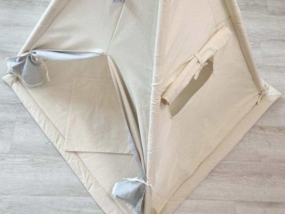 Dječji teepee šator u neutralnoj krem boji - sklonište, kućica, ugodno mjesto za igru i odmor. Uključuje prozorčić, ulaz, meku podlogu i fiksator za stabilnost.