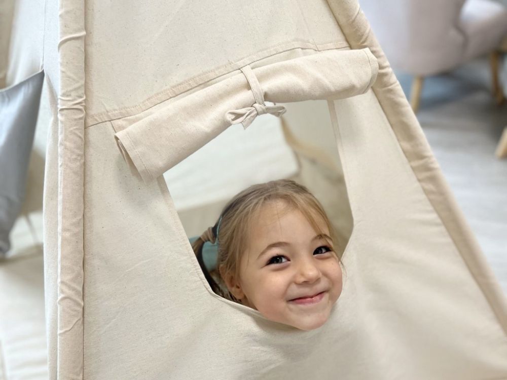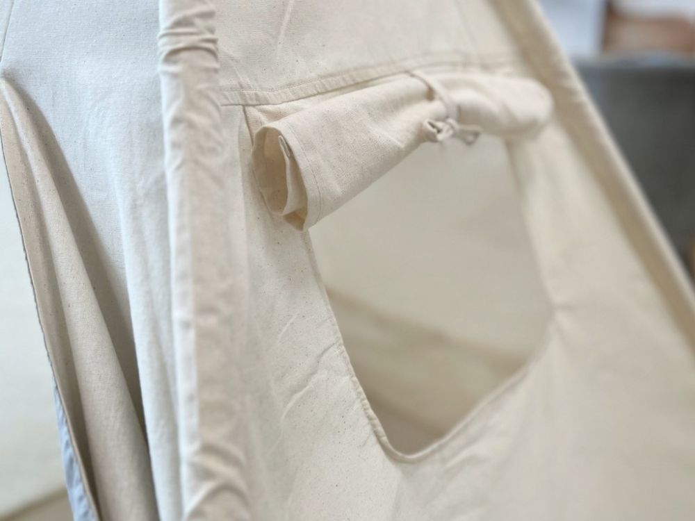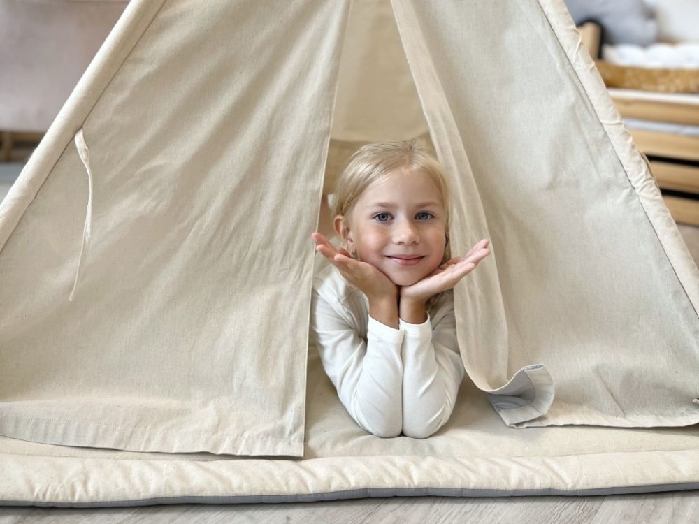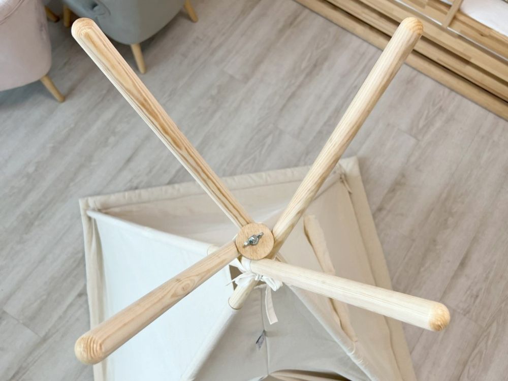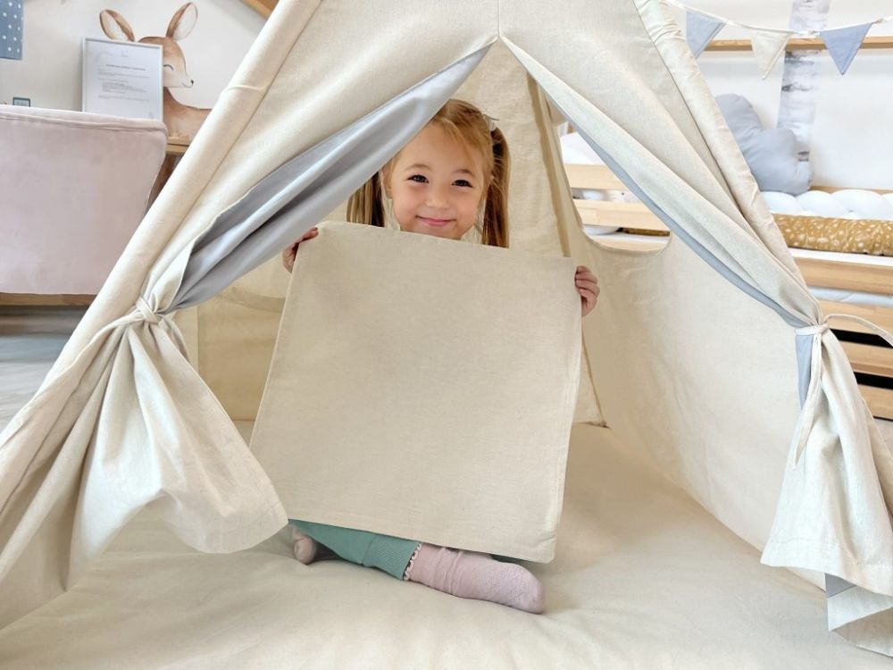 Dječji teepee šator u neutralnoj krem boji - sklonište, kućica, ugodno mjesto za igru i odmor. Uključuje prozorčić, ulaz, meku podlogu i fiksator za stabilnost.