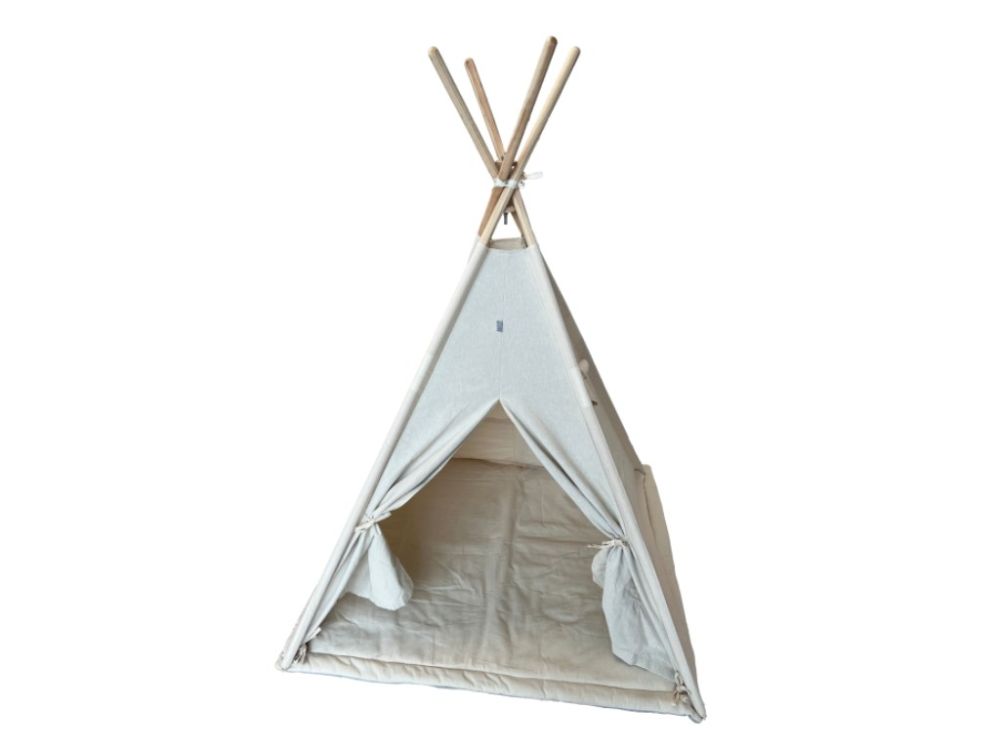 Stvorite djeci udoban i maštovit kutak s našim dječjim teepee šatorom u nježnoj krem boji. Šator je omiljeno mjesto za igru i odmor – pruža djeci sigurno skrovište u kojem se mogu sakriti, čitati, igrati se ili jednostavno uživati u miru. Teepee je izrađen od prozračne i ugodne tkanine te prirodnog drva, što ga čini ne samo lijepim, već i harmoničnim dodatkom dječjoj sobi u skladu s prirodom.