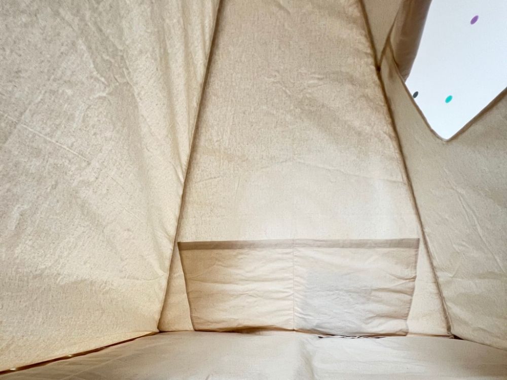 Teepee sadrži prozorčić, prostrani ulaz i praktične džepiće za omiljene igračke ili knjige. U setu se nalazi i jastučnica koja dodatno naglašava udobnost i toplinu prostora. Neutralna paleta boja lako se uklapa u svaki interijer i prikladna je za djevojčice i dječake.