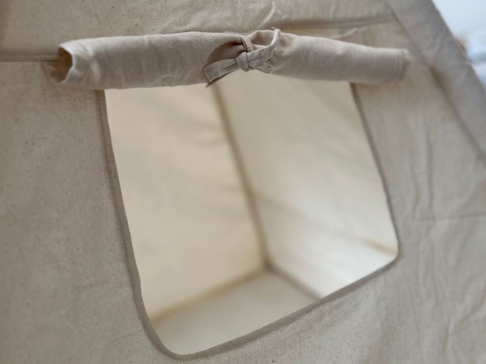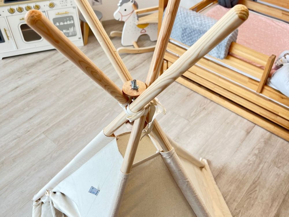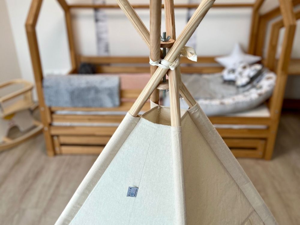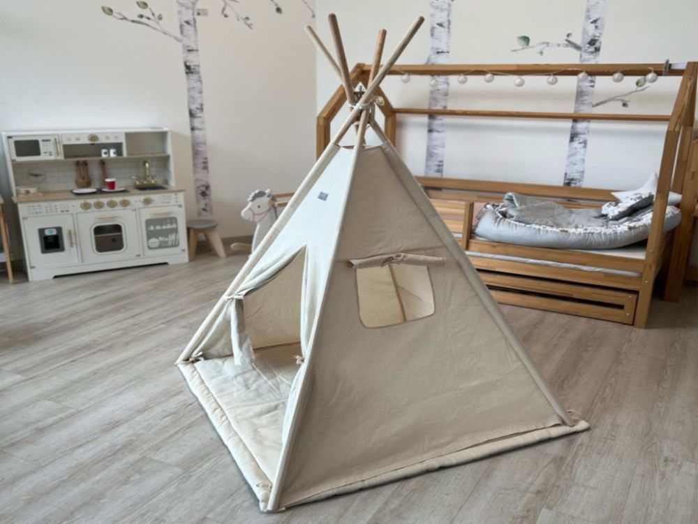 Stvorite djeci udoban i maštovit kutak s našim dječjim teepee šatorom u nježnoj krem boji. Šator je omiljeno mjesto za igru i odmor – pruža djeci sigurno skrovište u kojem se mogu sakriti, čitati, igrati se ili jednostavno uživati u miru. Teepee je izrađen od prozračne i ugodne tkanine te prirodnog drva, što ga čini ne samo lijepim, već i harmoničnim dodatkom dječjoj sobi u skladu s prirodom.