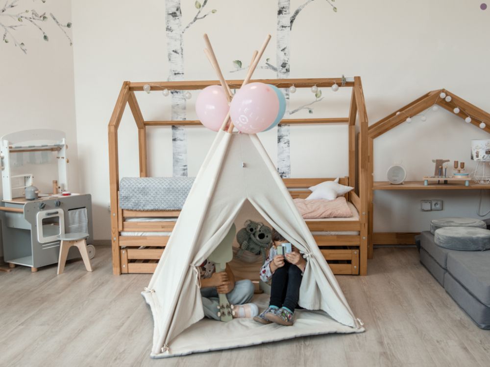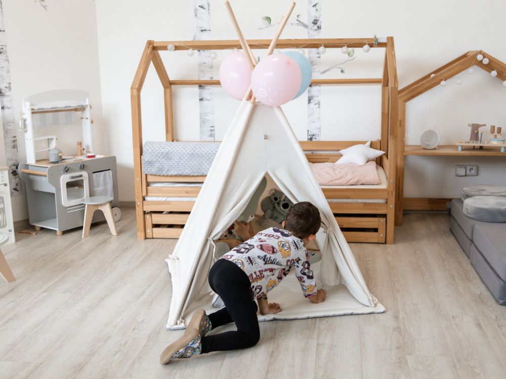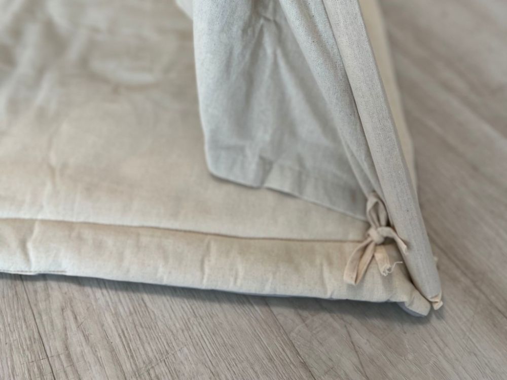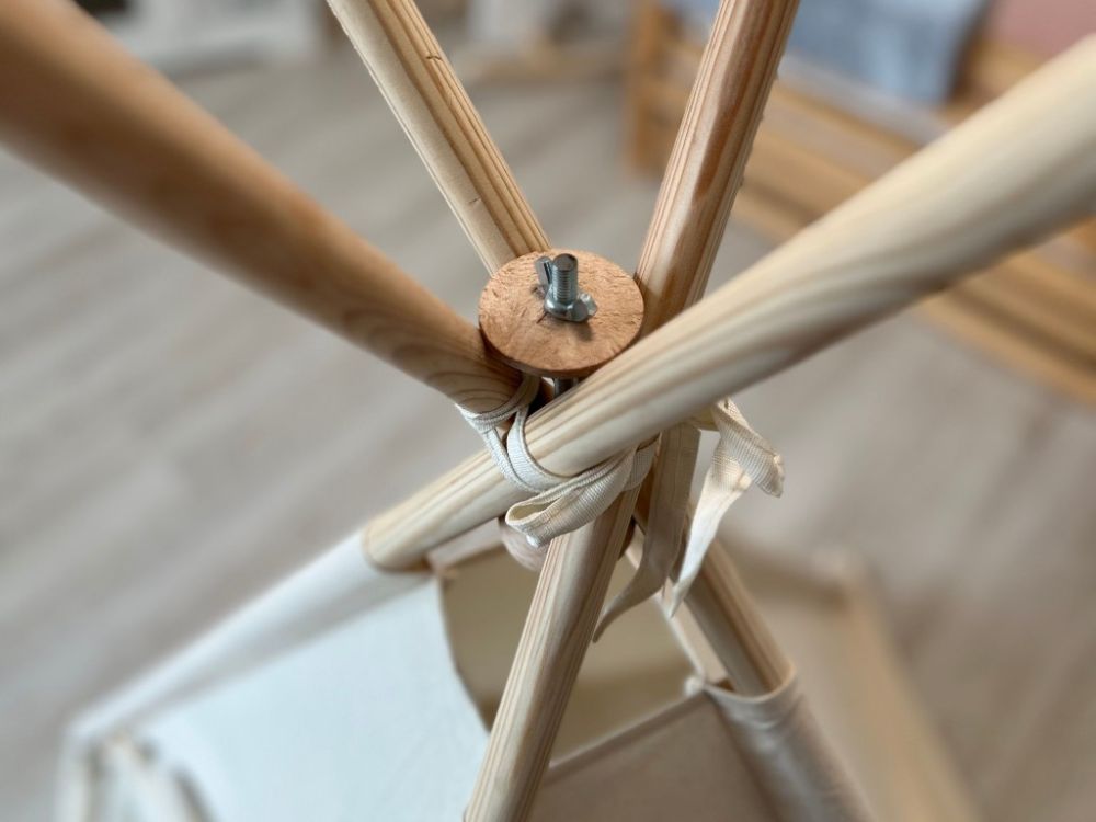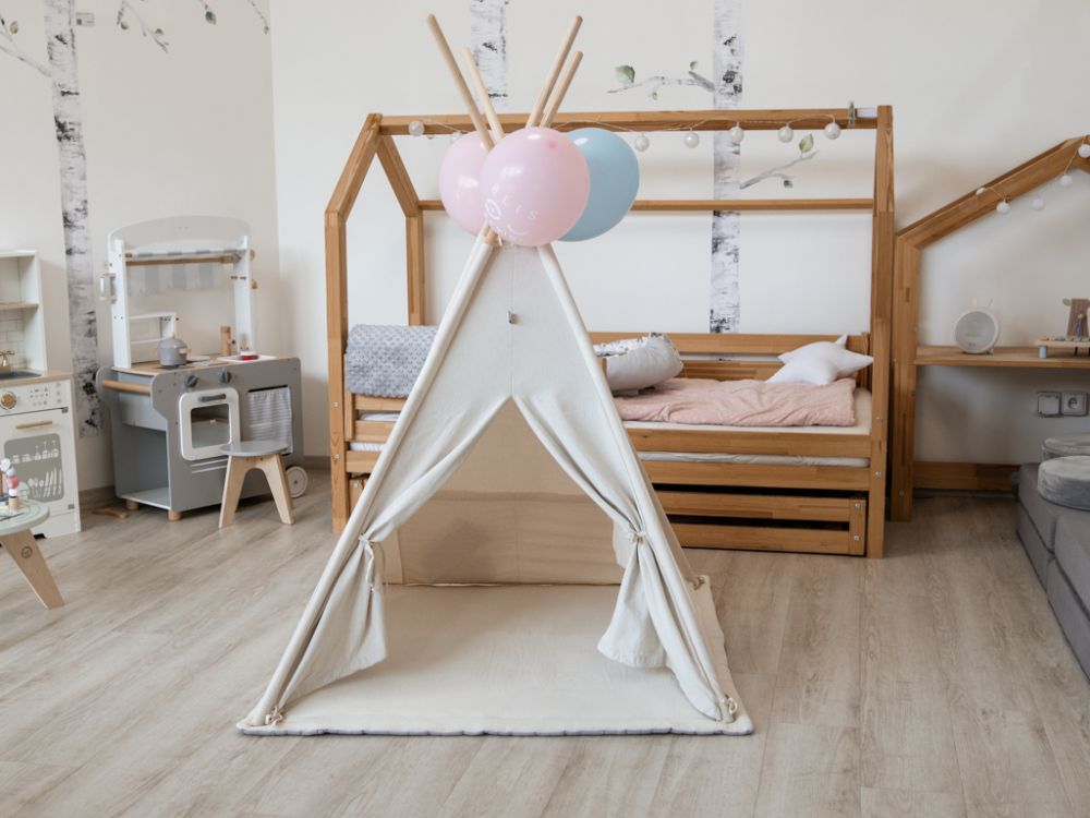 Stvorite djeci udoban i maštovit kutak s našim dječjim teepee šatorom u nježnoj krem boji. Šator je omiljeno mjesto za igru i odmor – pruža djeci sigurno skrovište u kojem se mogu sakriti, čitati, igrati se ili jednostavno uživati u miru. Teepee je izrađen od prozračne i ugodne tkanine te prirodnog drva, što ga čini ne samo lijepim, već i harmoničnim dodatkom dječjoj sobi u skladu s prirodom.