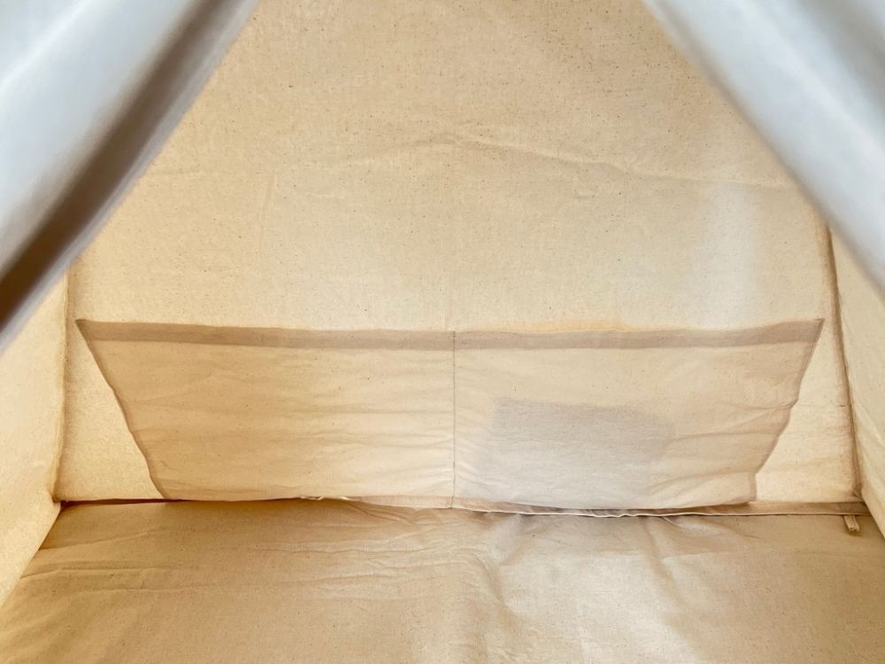 Zahvaljujući stabilizacijskom fiksatoru, konstrukcija ostaje čvrsta i stabilna, a šator se lako može postaviti u idealan oblik. U kompletu dolazi mekana obostrana podloga – s jedne strane u krem tonu koji odgovara šatoru, a s druge u elegantnoj sivoj boji. Isti sivi naglasak nalazi se i na unutarnjoj strani ulaza, što šatoru daje moderan i originalan izgled.