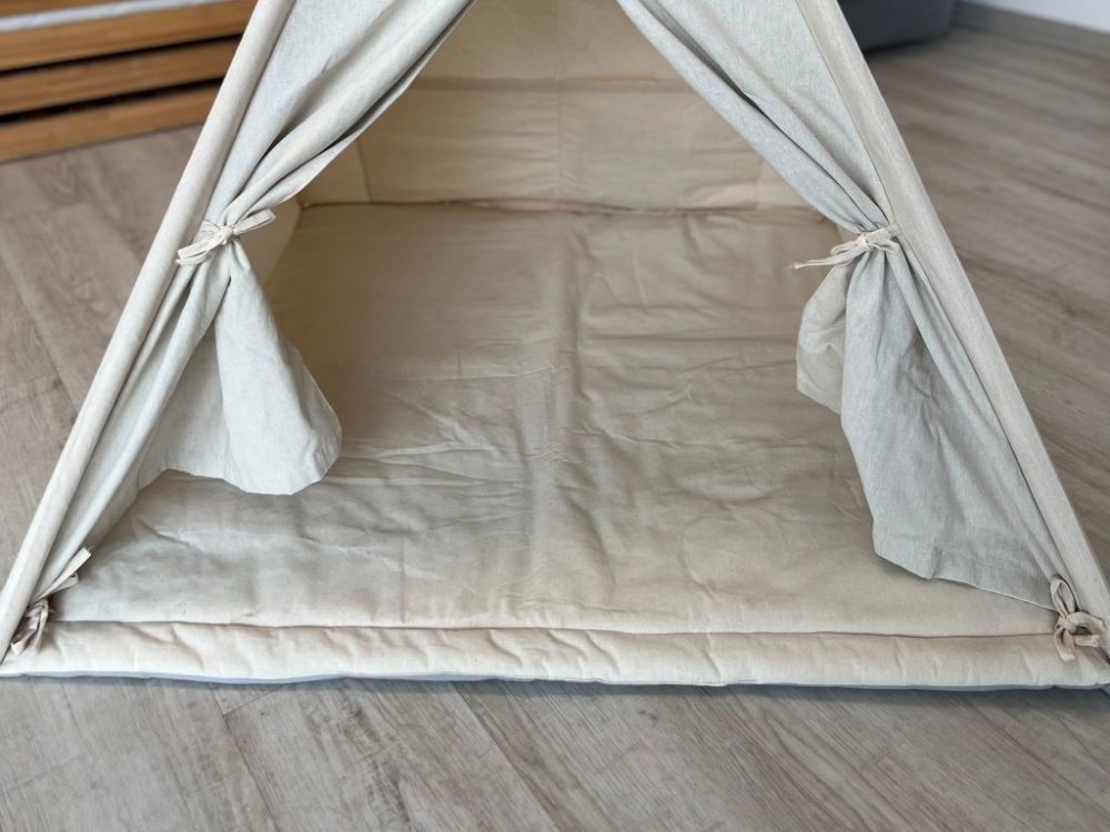 Paket sadrži: teepee šator, mekanu podlogu, jastučnicu, drvene štapove, stabilizacijski fiksator (sustav učvršćivanja).