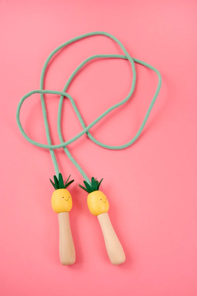Dječje uže za preskakanje s drvenim ručkama s motivom ananasa donosi radost kretanja. Vesele boje potiču maštu, a skakanje razvija motoriku. Prikladno za djecu od 3 godine, za dom i na otvorenom.