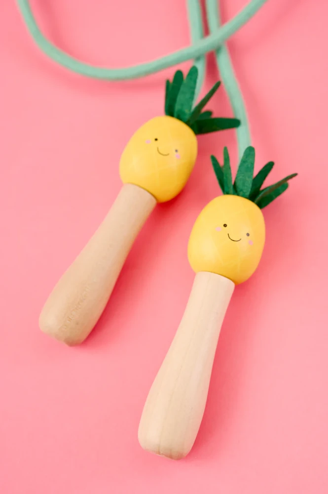 Dječje uže za preskakanje s drvenim ručkama s motivom ananasa donosi radost kretanja. Vesele boje potiču maštu, a skakanje razvija motoriku. Prikladno za djecu od 3 godine, za dom i na otvorenom.