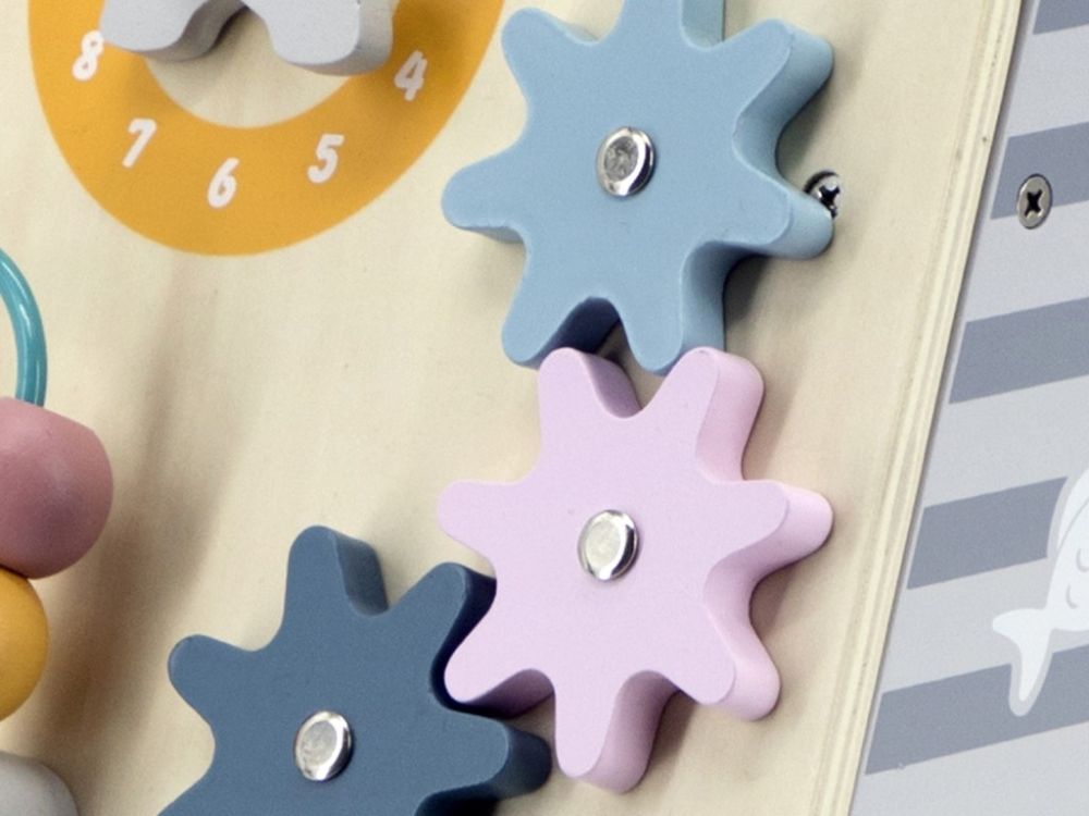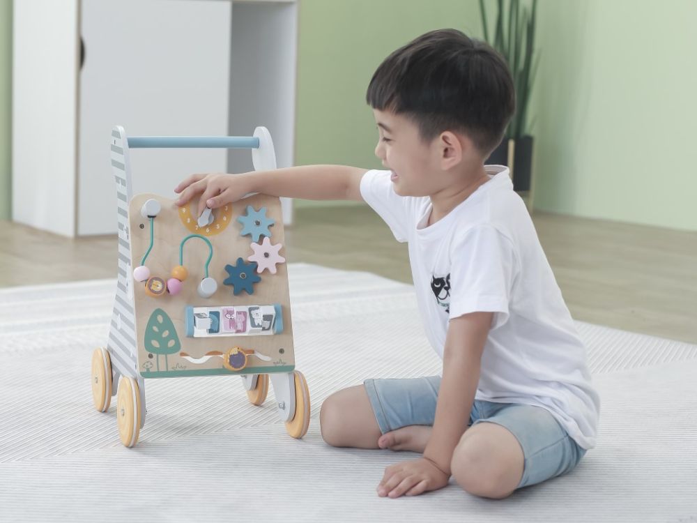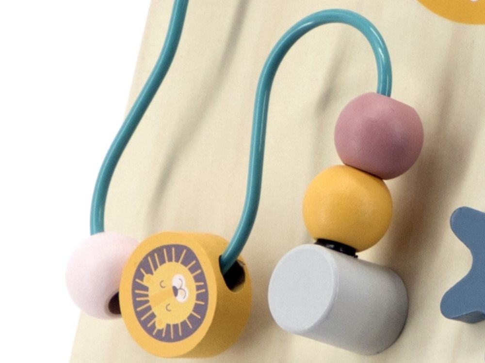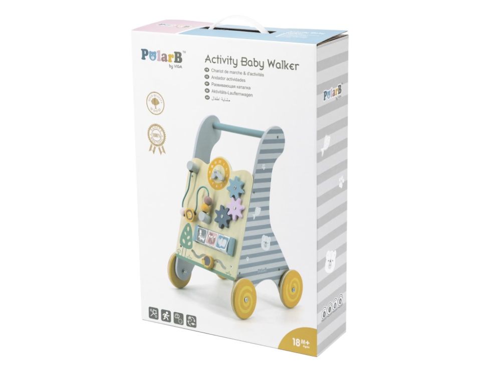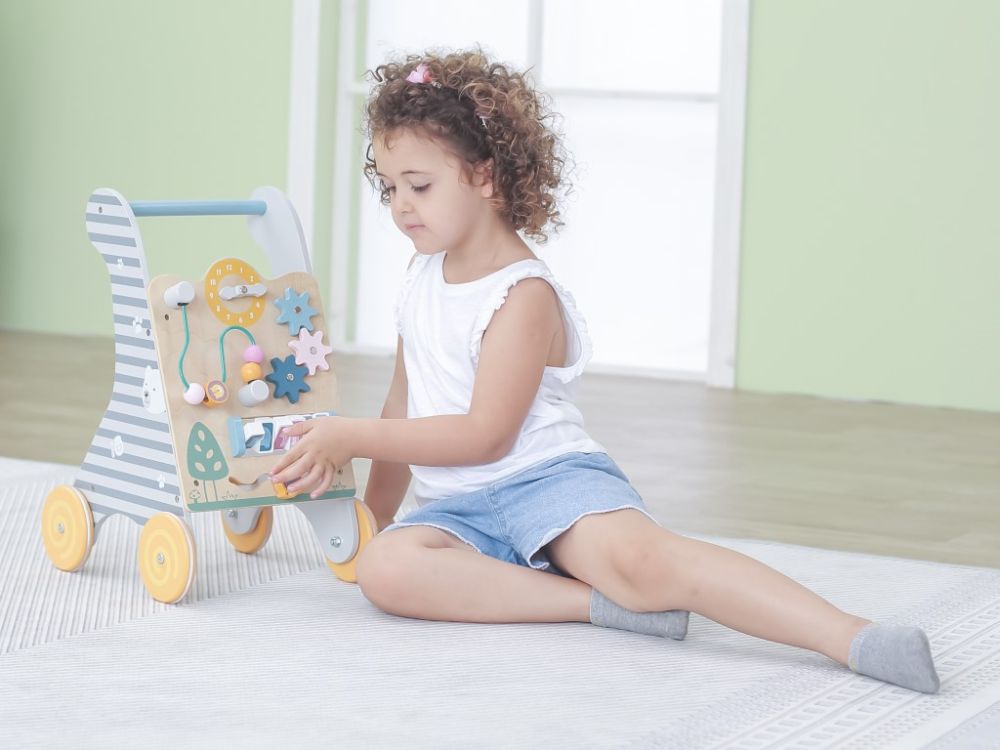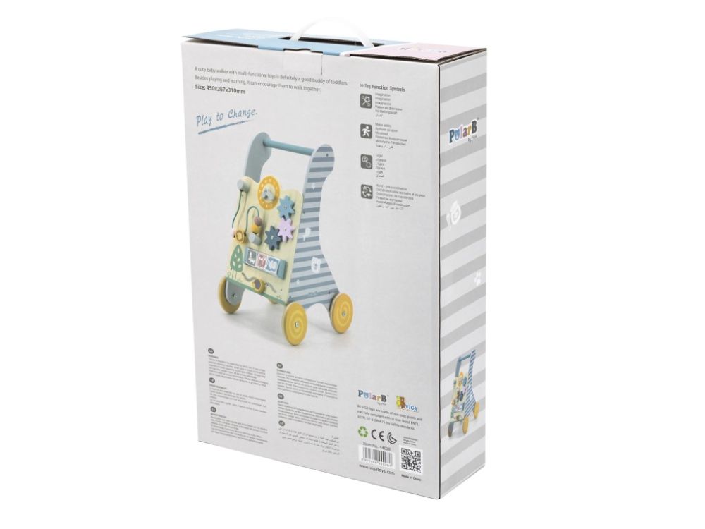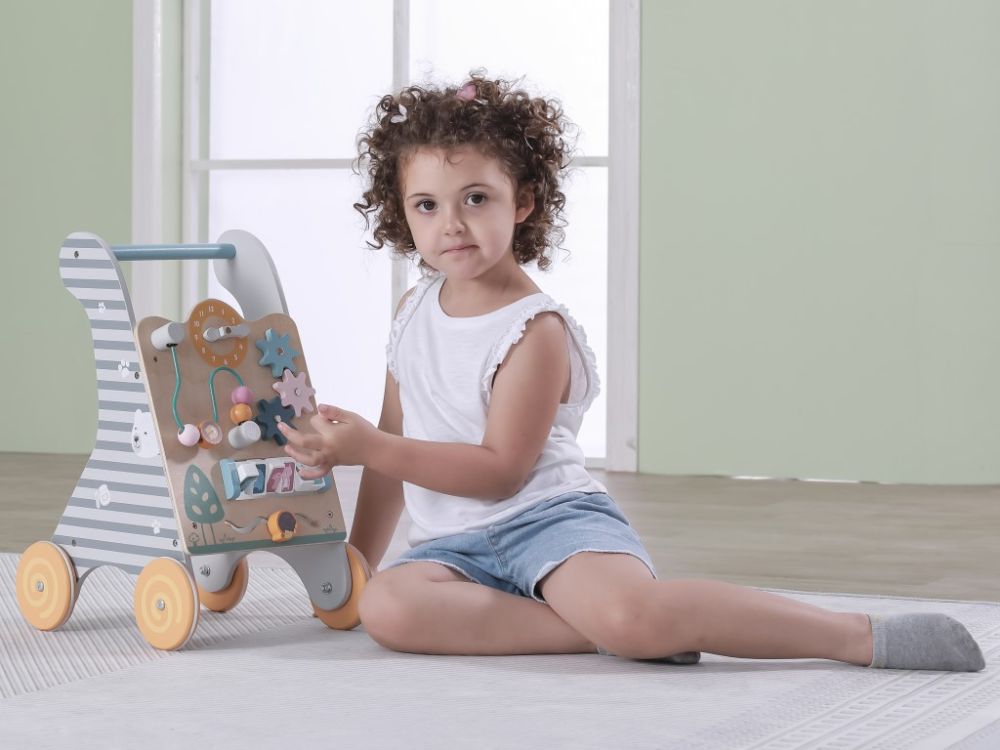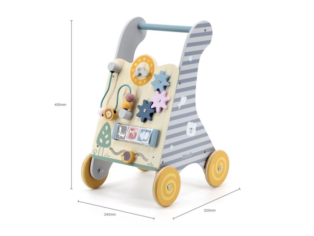 Višenamjenska drvena hodalica s aktivnostima u neutralnim bojama. Zupčanici, sat, kuglice na labirintu, životinjice. Razvija motoriku od 18 mjeseci.