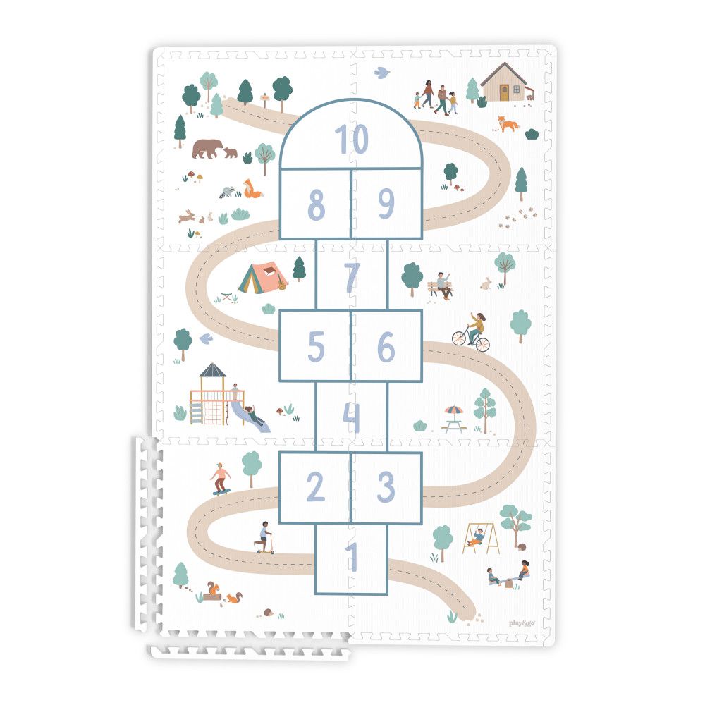 Druga strana podloge za igru je u neutralnoj bijeloj boji, s motivom kockica. Dvostrana podloga za igru izrađena je od netoksične EVA pjene, vrhunske kvalitete, prikladne i sigurne čak i za najmanju djecu. Dijelovi pjenaste slagalice također su vodootporni, što ćete posebno cijeniti prilikom čišćenja podloge za igru.