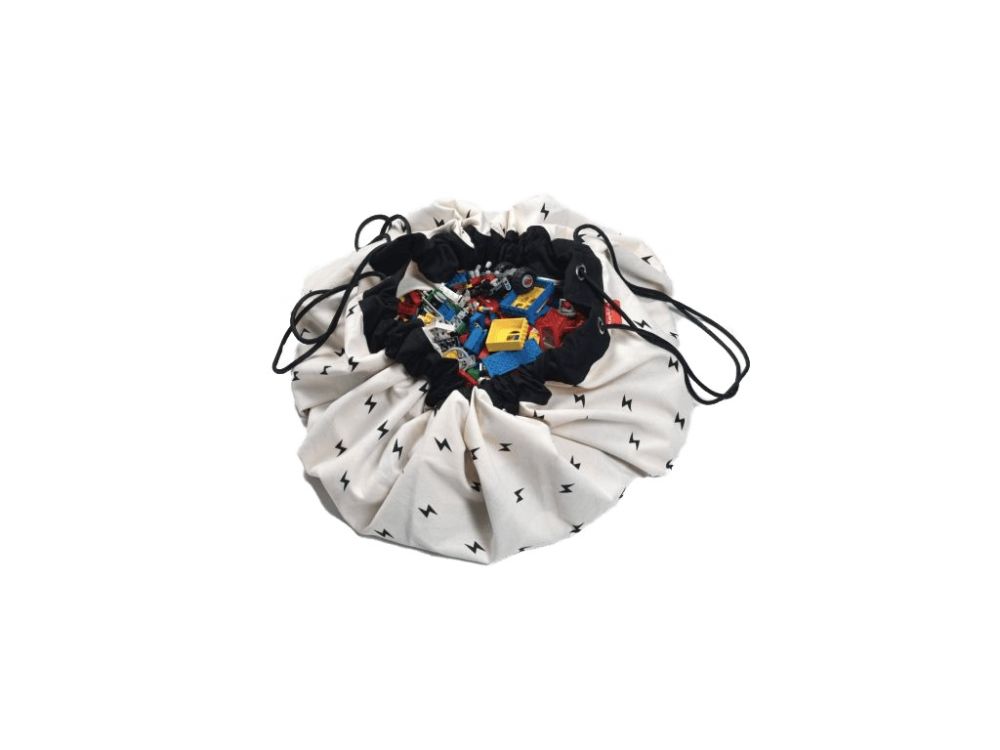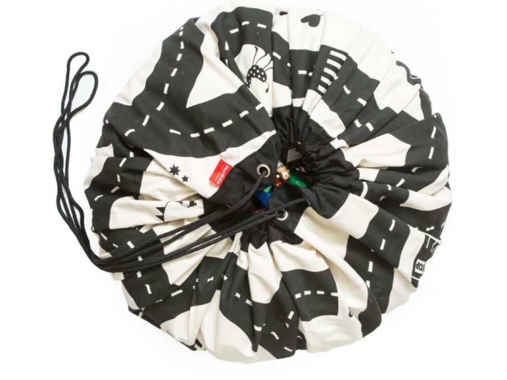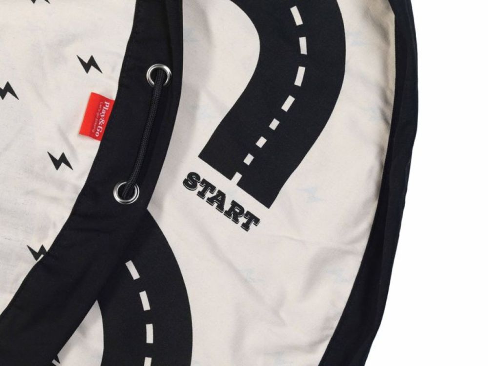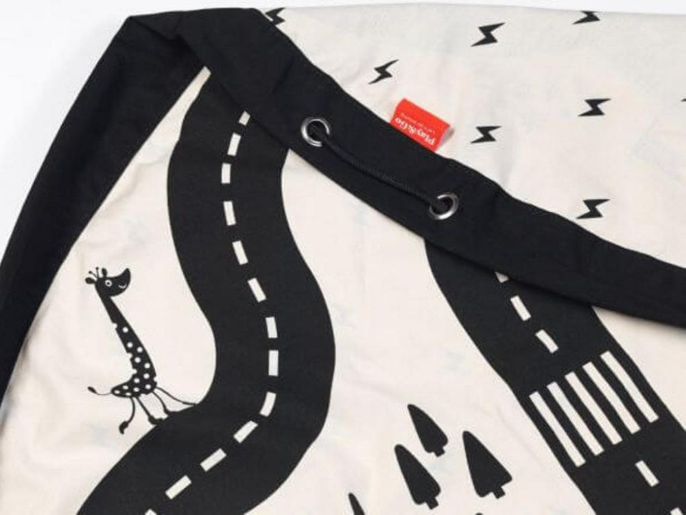 Vrećica za pohranu igračaka ima otisak s obje strane. Jedna strana vrećice je bijela s malim crnim munjama, a druga strana prikazuje ceste, zgrade, parkirališta i druge motive. Djeca mogu svakodnevno prelaziti označene ceste , a uz pomoć drugih građevinskih blokova, drvenih blokova, mogu izgraditi cijeli grad u svojoj sobi. Dizajnerska podloga za igru potaknut će dječju maštu i uvesti ih u svijet igre. Istovremeno će se igrati na toplom i neće im biti hladno od poda. A kad se umore od igre, samo povuku konac i bit će uredni u tren oka. Djeca će cijeniti ovaj način čišćenja.